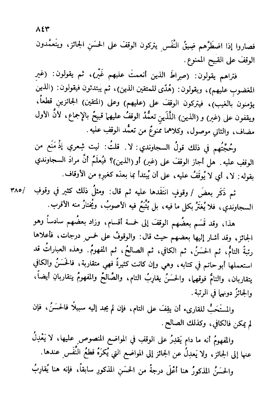 وَهَذَا وَقد قسم بَعضهم حَيْثُ قَالَ وَالْوُقُوف على خمس دَرَجَات فأعلاها رُتْبَة التَّام ثمَّ الْحسن ثمَّ الْكَافِي ثمَّ الصَّالح ثمَّ الْمَفْهُوم وَهَذِه الْعبارَات قد استعملها أَبُو حَاتِم فِي كِتَابه وَهِي وَإِن كَانَت كَثِيرَة فَهِيَ مُتَقَارِبَة فالحسن وَالْكَافِي يتقاربان والتام فَوْقهمَا وَالْحسن يُقَارب التَّام والصالح وَالْمَفْهُوم يتقاربان أَيْضا والجائز دونهمَا فِي الرُّتْبَة