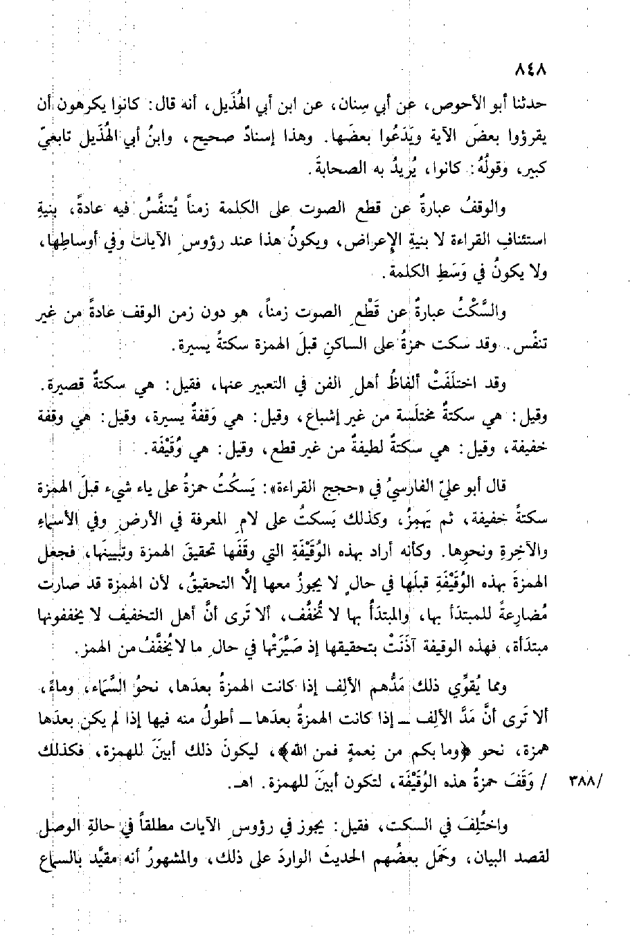 قَالَ أَبُو عَليّ الْفَارِسِي فِي حجيج الْقِرَاءَة يسكت حَمْزَة على يَاء شَيْء قبل الْهمزَة سكتة خَفِيفَة ثمَّ يهمز وَكَذَلِكَ يسكت على لَام الْمعرفَة فِي الأَرْض وَفِي الْأَسْمَاء وَالْآخِرَة وَنَحْوهَا وَكَأَنَّهُ راد بِهَذِهِ الوقيفة الَّتِي وَقفهَا تَحْقِيق الْهمزَة وتبيينها فَجعل الْهمزَة بِهَذِهِ الوقيفة قبلهَا فِي حَال لَا يجوز مَعهَا إِلَّا التَّحْقِيق لِأَن الْهمزَة قد صَارَت مضارعة للمبتدأ بهَا والمبتدأ بهَا لَا تخفف أَلا ترى أَن أهل التَّخْفِيف لَا يخففونها مُبتَدأَة فَهَذِهِ الوقيفة آذَنت بتحقيقها إِذْ صيرتها فِي حَال مَا لَا يُخَفف من الْهَمْز