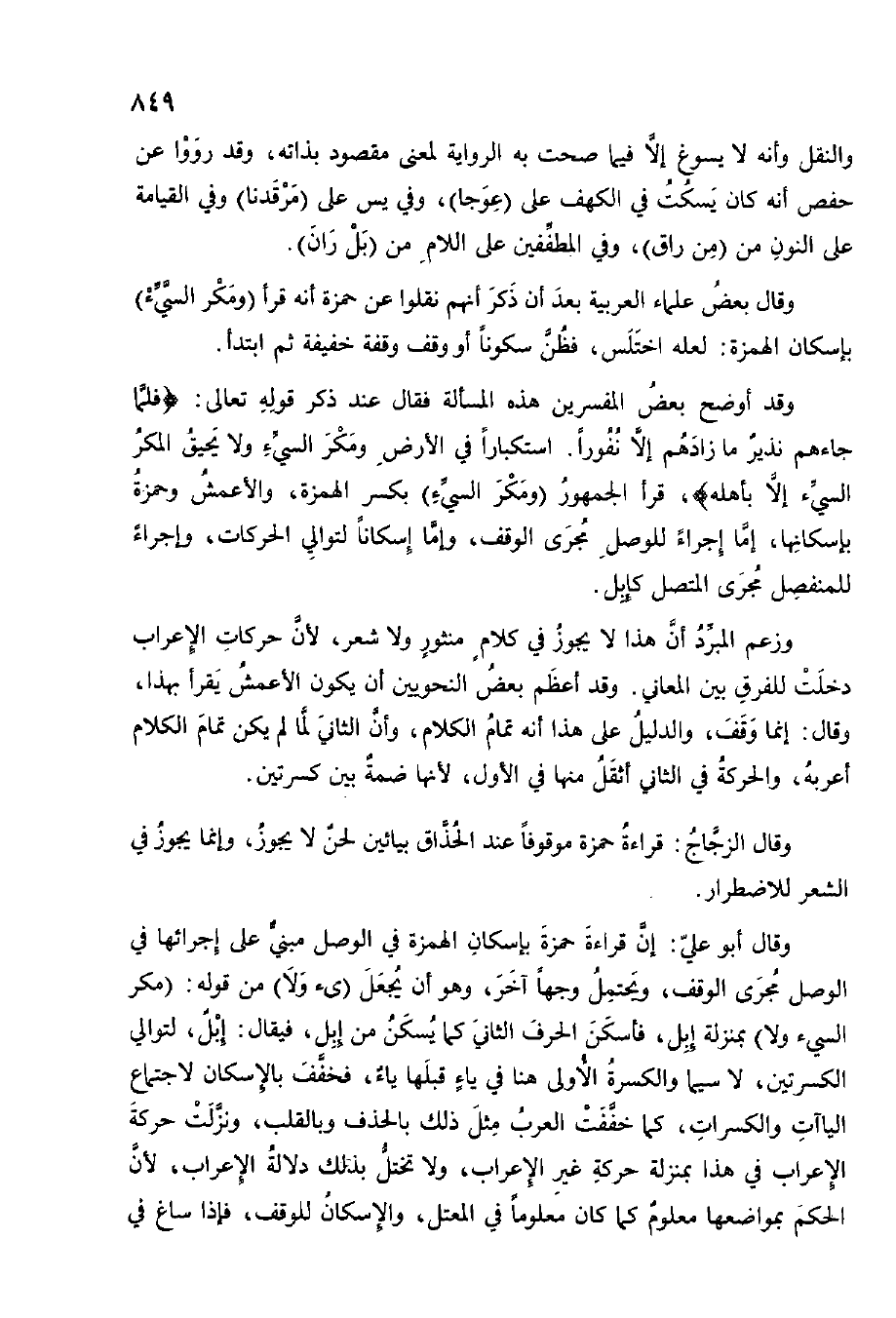 وَقَالَ أَبُو عَليّ إِن قِرَاءَة حَمْزَة بِإِسْكَان الْهمزَة فِي الْوَصْل مَبْنِيّ على إجرائها فِي الْوَصْل مجْرى الْوَقْف وَيحْتَمل وَجها آخر وَهُوَ أَن يَجْعَل (ئ وَلَا) من قَوْله (مكر السيء وَلَا) بِمَنْزِلَة إبل فأسكن الْحَرْف الثَّانِي كَمَا يسكن من إبل فَيُقَال إبل لتوالي الكسرتين لَا سِيمَا والكسرة الأولى هُنَا فِي يَاء فَخفف بِإِسْكَان لِاجْتِمَاع الياآت والكسرات كَمَا خففت الْعَرَب مثل ذَلِك بالحذف وبالقلب وَنزلت حَرَكَة الْإِعْرَاب فِي هَذَا بِمَنْزِلَة حَرَكَة غير الْإِعْرَاب وَلَا تختل بذلك دلَالَة الْإِعْرَاب لِأَن الحكم بمواضعها مَعْلُوم كَمَا كَانَ مَعْلُوما فِي المعتل والإسكان للْوَقْف فَإِذا سَاغَ فِي