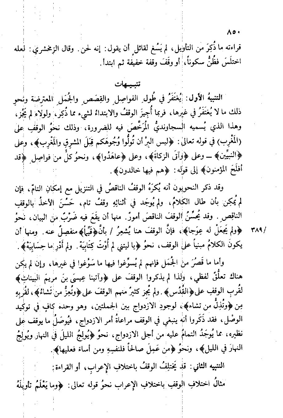 التَّنْبِيه الأول يغْتَفر فِي طول الفواصل والقصص والجمل المعترضة وَنَحْو ذَلِك مَا لَا يغْتَفر فِي غَيرهَا فَرُبمَا أُجِيز الْوَقْف والابتداء لشَيْء مِمَّا ذكر ولولاه لم يجز وَهَذَا الَّذِي يُسَمِّيه السجاوندي المرخص فِيهِ للضَّرُورَة وَذَلِكَ نَحْو الْوَقْف على الْمغرب فِي قَوْله تَعَالَى {لَيْسَ الْبر أَن توَلّوا وُجُوهكُم قبل الْمشرق وَالْمغْرب} وعَلى {النَّبِيين} وعَلى {عَاهَدُوا} وَنَحْو كل من فواصل {قد أَفْلح الْمُؤْمِنُونَ} إِلَى قَوْله {هم فِيهَا خَالدُونَ}
