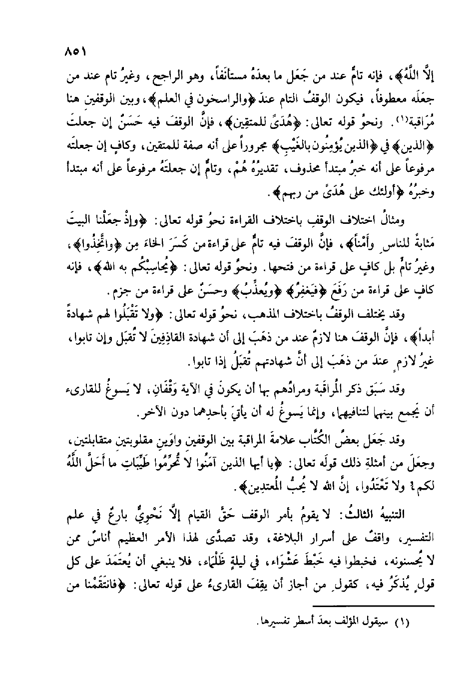 فَإِنَّهُ تَامّ عِنْد من جعل مَا بعده مستأنفا وَهُوَ الرَّاجِح وَغير تَامّ عِنْد من جعله مَعْطُوفًا فَيكون الْوَقْف التَّام عِنْد {الراسخون فِي الْعلم} وَبَين الوقفين هَا مراقبة وَنَحْو قَوْله تَعَالَى {هدى لِلْمُتقين} فَإِن الْوَقْف فِيهِ حسن إِن جعلته {الَّذين} فِي {الَّذين يُؤمنُونَ بِالْغَيْبِ} مجرورا على أَنه خبر مُبْتَدأ مَحْذُوف تَقْدِيره هم وتام إِن جعلته مَرْفُوعا على أَنه مُبْتَدأ وَخَبره {أُولَئِكَ على هدى من رَبهم}
