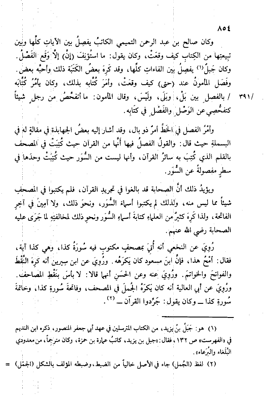 وَكَانَ صَالح بن عبد الرَّحْمَن التَّمِيمِي الْكَاتِب يفصل بَين الْآيَات كلهَا وَبَين تبيعتها من الْكتاب كَيفَ وَقعت وَكَانَ يَقُول مَا استؤنف إِن إِلَّا وَقع الْفَصْل وَكَانَ جبل يفصل بَين الفاءات كلهَا وَقد كره بعض الكتبة ذَلِك وأحبه يَأْمر كِتَابه بِالْفَصْلِ بَين بل وبلى وَلَيْسَ وَقَالَ الْمَأْمُون مَا أتفحص من رجل شَيْئا كتفحصي عَن الْوَصْل وَالْفضل فِي كِتَابه