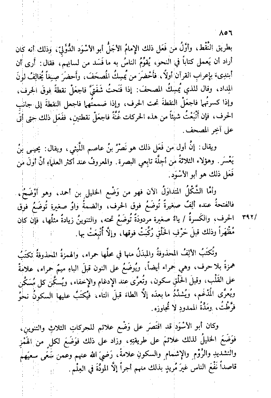 وَكَانَ أَبُو الْأسود قد اقْتصر على وضع علائم للحركات الثَّلَاث والتنوين فَوضع الْخَلِيل لذَلِك علائم على طَرِيقَته وَزَاد على ذَلِك فَوضع لكل من الْهَمْز وَالتَّشْدِيد وَالروم والإشمام والسكون عَلامَة رَضِي الله عَنْهُم وَعَمن سعى سَعْيهمْ قَاصِدا نفع النَّاس غير مُرِيد بذلك مِنْهُم أجرا إِلَّا الْمَوَدَّة فِي الْعلم