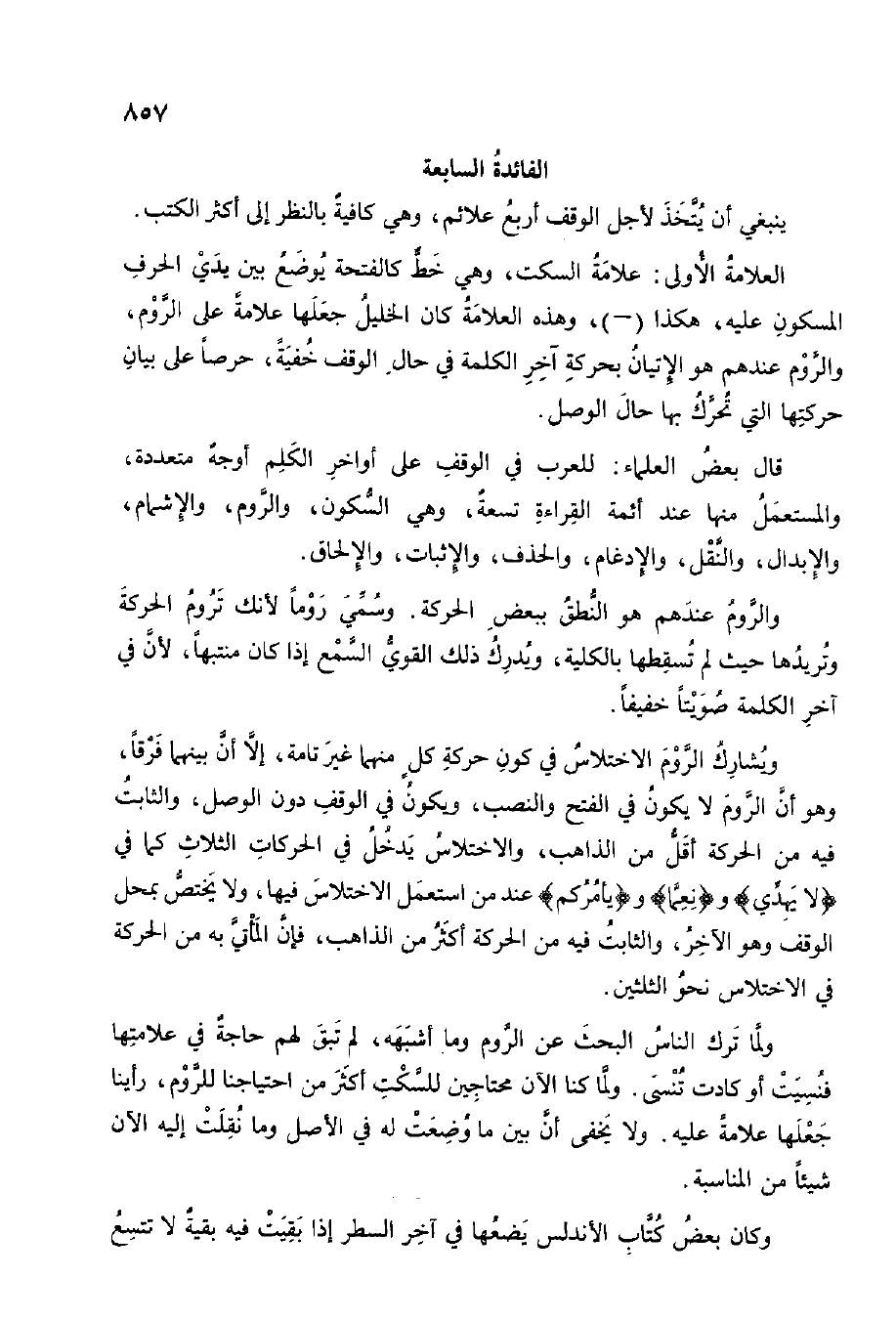 قَالَ بعض الْعلمَاء للْعَرَب فِي الْوَقْف على أَوَاخِر الْكَلم أوجه مُتعَدِّدَة والمستعمل مِنْهَا عِنْد أَئِمَّة الْقِرَاءَة تِسْعَة وَهِي السّكُون وَالروم والإشمام والإبدال وَالنَّقْل والإدغام والحذف وَالْإِثْبَات والإلحاق