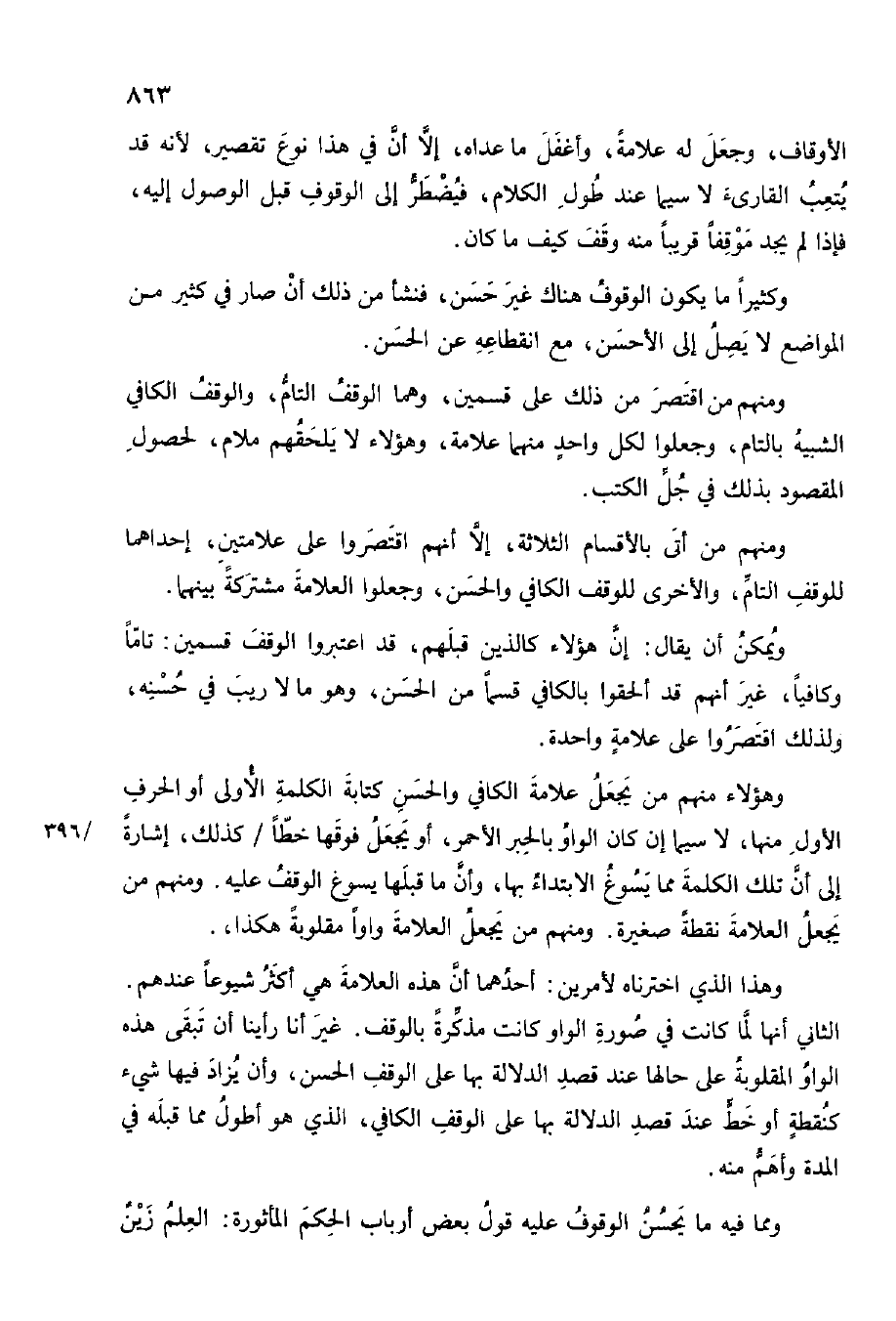 وَهَذَا الَّذِي اخترناه لأمرين أَحدهمَا أَن هَذِه الْعَلامَة هِيَ أَكثر شيوعا عِنْدهم الثَّانِي أَنَّهَا لما كَانَت فِي صُورَة الْوَاو كَانَت مذكرة بِالْوَقْفِ غير أَنا رَأينَا ان تبقى هَذِه الْوَاو المقلوبة على حَالهَا عِنْد قصد الدّلَالَة بهَا على الْوَقْف الْحسن وَأَن يُزَاد فِيهَا شَيْء كنقطة أَو خطّ عِنْد قصد الدّلَالَة بهَا على الْوَقْف الْكَافِي الَّذِي هُوَ أطول مِمَّا قبله فِي الْمدَّة وأهم مِنْهُ