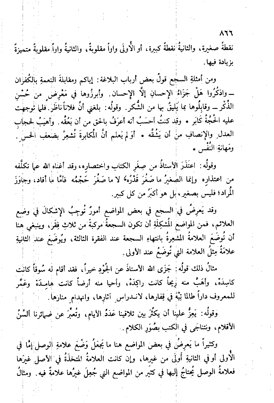 وَقد يعرض فِي السجع فِي بعض الْمَوَاضِع أُمُور توجب الْإِشْكَال فِي وضع العلائم فَمن الْمَوَاضِع المشكلة أَن تكون السجعة مركبة من ثَلَاث فقر وَيَنْبَغِي هُنَا أَن تُوضَع الْعَلامَة المشعرة بانتهاء السجعة عِنْد الْفَقْرَة الثَّالِثَة وَيُوضَع عِنْد الثَّانِيَة عَلامَة مثل الْعَلامَة الَّتِي تُوضَع عِنْد الأولى