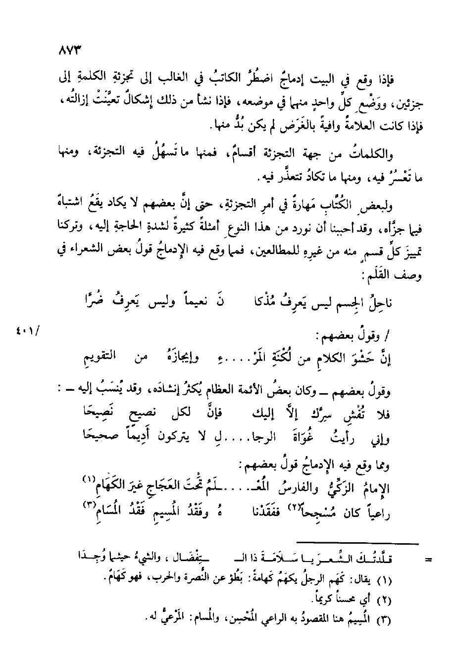 ولبعض الْكتاب مهارة فِي أَمر التجزئة حَتَّى إِن بَعضهم لَا يكَاد يَقع اشْتِبَاه فِيمَا جزأه وَقد أحببنا أَن نورد من هَذَا النَّوْع أَمْثِلَة كَثِيرَة لشدَّة الْحَاجة إِلَيْهِ وَتَركنَا تَمْيِيز كل قسم مِنْهُ من غَيره للمطالعين فمما وَقع فِيهِ الإدماج قَول بعض الشُّعَرَاء فِي وصف الْقَلَم