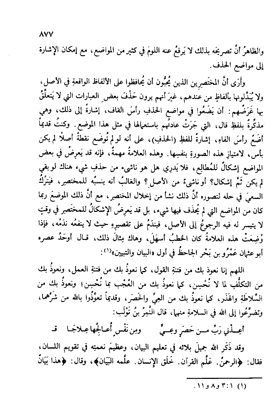 وَأرى أَن المختصرين الَّذين يحبونَ أَن يحافظوا على الْأَلْفَاظ الْوَاقِعَة فِي الأَصْل وَلم يبدلونها بِأَلْفَاظ من عِنْدهم غير أَنهم يرَوْنَ حذف بعض الْعبارَات الَّتِي لَا يتَعَلَّق بهَا غرضهم أَن يضعوا فِي مَوَاضِع الْحَذف رَأس الْقَاف إِشَارَة إِلَى ذَلِك وَهِي مذكرة بِلَفْظ قَالَ الَّتِي جرت عَادَتهم باستعمالها فِي مثل هَذَا الْموضع وَكنت قَدِيما أَضَع رَأس الْفَاء إِشَارَة للفظ الْحَذف على أَنه لَو لم تُوضَع نقطة أصلا لم يكن بَأْس لامتياز هَذِه الصُّورَة بِنَفسِهَا وَهَذِه الْعَلامَة مهمة فَإِنَّهُ قد يعرض فِي بعض الْمَوَاضِع إِشْكَال للمطالع فَلَا يدْرِي هَل هُوَ ناشيء من حذف شَيْء هُنَاكَ لَو بَقِي لم يكن ثمَّ إِشْكَال أَو ناشيء من الأَصْل وَالْغَالِب أَنه ينْسبهُ للمختصر فَيتْرك السَّعْي فِي حلّه لتصوره أَن ذَلِك نَشأ من إخلال الْمُخْتَصر مَعَ أَن ذَلِك الْموضع رُبمَا كَانَ من الْمَوَاضِع الَّتِي لم يحذف فِيهَا شَيْء بل قد يعرض الْإِشْكَال للمختصر فِي وَقت لَا يَتَيَسَّر لَهُ فِيهِ الرُّجُوع إِلَى الأَصْل فيندم على تَقْصِيره حَيْثُ لَا يَنْفَعهُ ندمه فَإِذا وضعت هَذِه الْعَلامَة كَانَ الْخطب أسهل وهاك مِثَال ذَلِك قَالَ أوحد عصره أَبُو عُثْمَان عَمْرو بن بَحر الجاحظ فِي أول الْبَيَان والتبيين