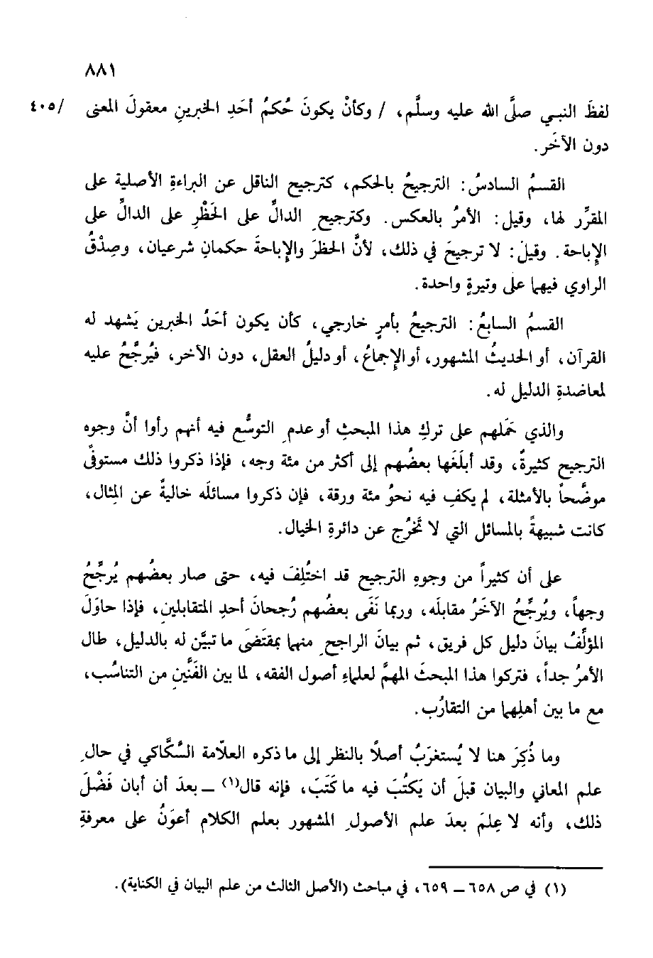 وَالَّذِي حملهمْ على ترك هَذَا المبحث أَو عدم التَّوَسُّع فِيهِ أَنهم رَأَوْا أَن وُجُوه التَّرْجِيح كَثِيرَة وَقد أبلغهَا بَعضهم إِلَى أَكثر من مئة وَجه فَإِذا ذكرُوا ذَلِك مُسْتَوفى موضحا بالأمثلة لم يكف فِيهِ نَحْو مئة ورقة فَإِن ذكرُوا مسائلة خَالِيَة عَن الْمِثَال كَانَت شَبيهَة بالمسائل الَّتِي لَا تخرج عَن دَائِرَة الخيال