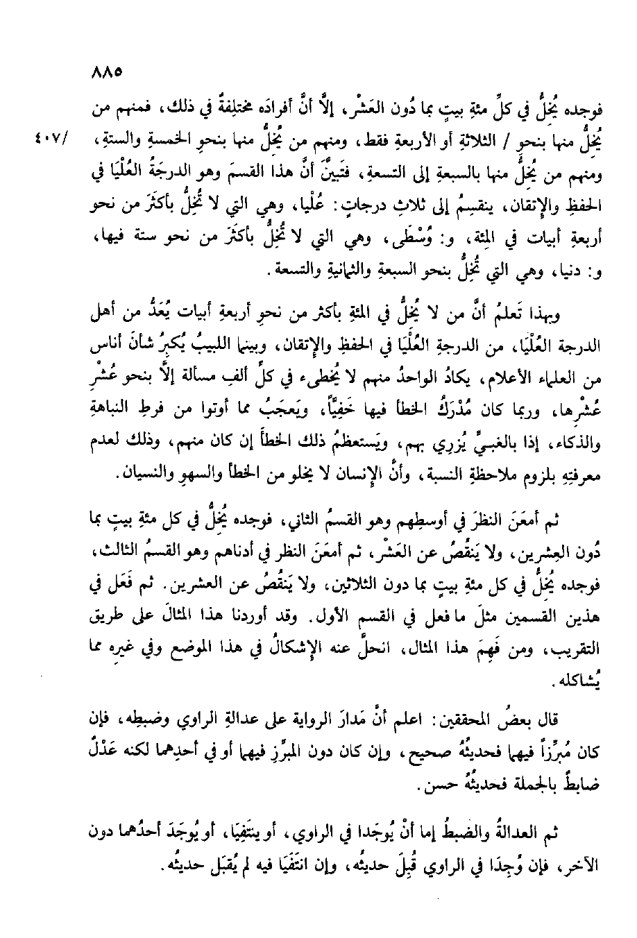 فَوَجَدَهُ يخل فِي كل مئة بَيت بِمَا دون الْعشْر إِلَّا أَن أَفْرَاده مُخْتَلفَة فِي ذَلِك فَمنهمْ من يخل مِنْهَا بِنَحْوِ / الثَّلَاثَة أَو الْأَرْبَعَة فَقَط وَمِنْهُم من يخل مِنْهَا بِنَحْوِ الْخَمْسَة والستة وَمِنْهُم من يخل مِنْهَا بالسبعة إِلَى التِّسْعَة فَتبين أَن هَذَا الْقسم وَهُوَ الدرجَة الْعليا فِي الْحِفْظ والإتقان يَنْقَسِم إِلَى ثَلَاث دَرَجَات عليا وَهِي الَّتِي لَا تخل بِأَكْثَرَ من نَحْو أَرْبَعَة أَبْيَات فِي المئة ووسطى وَهِي الَّتِي لَا تخل بِأَكْثَرَ من نَحْو سِتَّة فِيهَا وَدُنْيا وَهِي الَّتِي تخل بِنَحْوِ السَّبْعَة وَالثَّمَانِيَة والتسعة