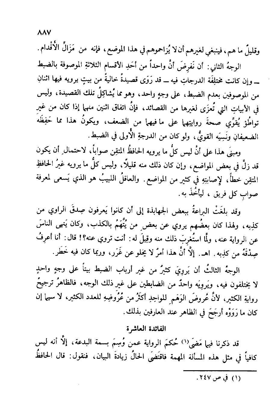 الْوَجْه الثَّانِي ان نفرض أَن وَاحِدًا من أحد الْأَقْسَام الثَّلَاثَة الموصوفة بالضبط - وَإِن كَانَ مُخْتَلفَة الدَّرَجَات فِيهِ - قد روى قصيدة خَالِيَة من بَيت يرويهِ فِيهَا اثْنَان من الموصوفين بِعَدَمِ الضَّبْط على وَجه وَاحِد وَهُوَ مِمَّا يشاكل تِلْكَ القصيدة وَلَيْسَ فِي الأبيات الَّتِي تعزى لغَيْرهَا من القصائد فَإِن اتِّفَاق اثْنَيْنِ مِنْهُمَا إِذا كَانَ من غير تواطؤ يقوى صِحَة روايتهما على مَا فيهمَا من الضعْف وَيكون هَذَا مِمَّا حفظه الضعيفان ونسيه الْقوي وَلَو كَانَ من الدرجَة الأولى فِي الضَّبْط