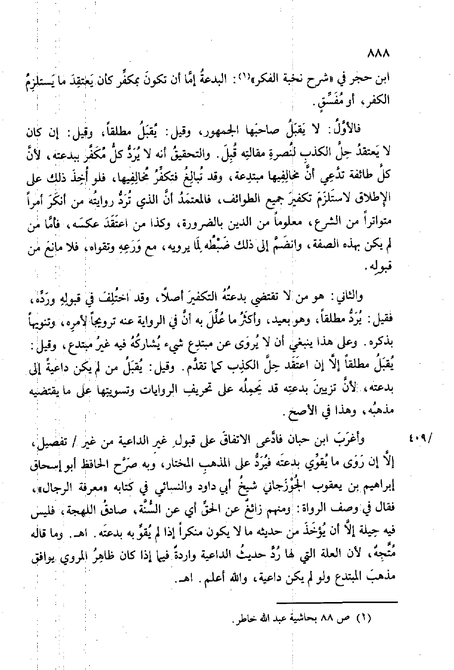 وَالثَّانِي هُوَ من لَا تَقْتَضِي بدعته التَّكْفِير أصلا وَقد اخْتلف فِي قبُوله ورده فَقيل يرد مُطلقًا وَهُوَ بعيد وَأكْثر مَا علل بِهِ أَن فِي الرِّوَايَة عَنهُ ترويحا لأَمره وتنويها بِذكرِهِ وعَلى هَذَا يَنْبَغِي أَن لَا يروي عَن مُبْتَدع شَيْء يُشَارِكهُ فِيهِ غير مُبْتَدع وَقيل يقبل مُطلقًا إِلَّا ان اعْتقد حل الْكَذِب كَمَا تقدم وَقيل يقبل من لم يكن دَاعِيَة إِلَى بدعته لِأَن تَزْيِين بدعته قد يحملهُ على تَحْرِيف الرِّوَايَات وتسويتها على مَا يَقْتَضِيهِ مذْهبه وَهَذَا فِي الْأَصَح