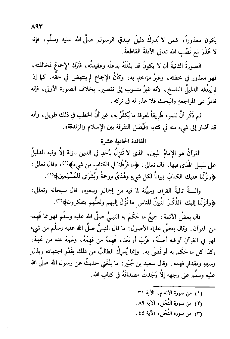 الْقُرْآن هُوَ الإِمَام الْمُبين الَّذِي لَا تنزل بِأحد فِي الدّين نازلة إِلَّا وَفِيه الدَّلِيل على سَبِيل الْهدى فِيهِ قَالَ تَعَالَى {مَا فرطنا فِي الْكتاب من شَيْء} وَقَالَ تَعَالَى {وأنزلنا إِلَيْك الذّكر لتبين للنَّاس مَا نزل إِلَيْهِم ولعلهم يتفكرون}