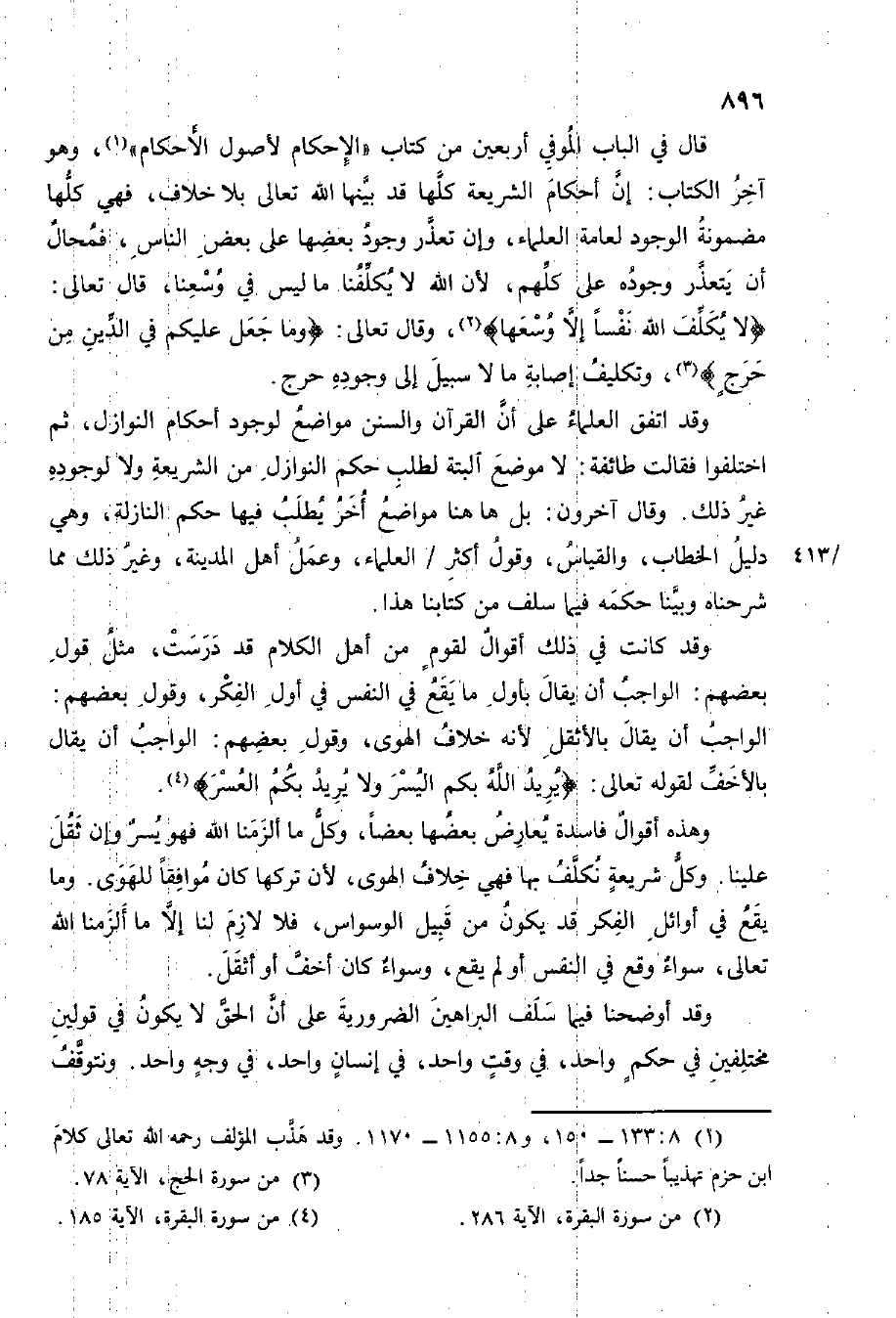 قَالَ فِي الْبَاب الموفي أَرْبَعِينَ من كتاب الإحكام لأصول الْأَحْكَام وَهُوَ آخر الْكتاب إِن أَحْكَام الشَّرِيعَة كلهَا قد بَينهَا الله تَعَالَى بِلَا خلاف فَهِيَ كلهَا مَضْمُونَة الْوُجُود لعامة الْعلمَاء وَإِن تعذر وجود بَعْضهَا على بعض النَّاس فمحال أَن يتَعَذَّر وجوده على كلهم لِأَن الله لَا يكلفنا مَا لَيْسَ فِي وسعنا قَالَ تَعَالَى {لَا يُكَلف الله نفسا إِلَّا وسعهَا} وَقَالَ تَعَالَى {وَمَا جعل عَلَيْكُم فِي الدّين من حرج} وتكليف إِصَابَة مَا لَا سَبِيل إِلَى وجود حرج