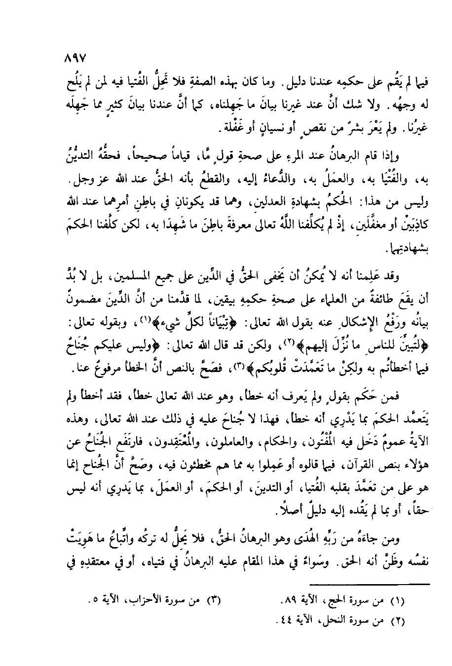 وَقد علمنَا أَنه لَا يُمكن أَن يخفى الْحق فِي الدّين على جَمِيع الْمُسلمين بل لَا بُد أَن يَقع طَائِفَة من الْعلمَاء على صِحَة حكمه بِيَقِين لما قدمنَا من أَن الدّين مَضْمُون بَيَانه وَرفع الْإِشْكَال عَنهُ بقول الله تَعَالَى {تبيانا لكل شَيْء} وَبِقَوْلِهِ تَعَالَى {لتبين للنَّاس مَا نزل إِلَيْهِم} وَلَكِن قد قَالَ الله تَعَالَى (وَلَيْسَ عَلَيْكُم جنَاح فِيمَا أخطأتم بِهِ وَلَكِن مَا تَعَمّدت قُلُوبكُمْ) فصح بِالنَّصِّ أَن الْخَطَأ مَرْفُوع عَنَّا