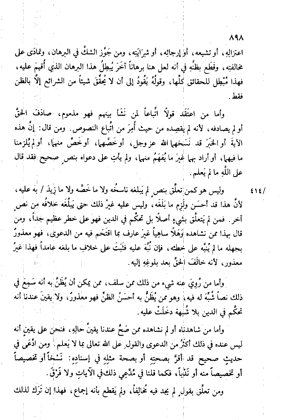 وَأما من شَاهَدْنَاهُ أَو لم نشاهده مِمَّن صَحَّ عندنَا يَقِين حَاله فَنحْن على يَقِين أَنه لَيْسَ عِنْده فِي ذَلِك أَكثر من الدَّعْوَى وَالْقَوْل على الله تَعَالَى بِمَا لَا يعلم وَمن ادّعى فِي حَدِيث صَحِيح قد أقرّ بِصِحَّتِهِ أَو بِصِحَّة مثله فِي إِسْنَاده نسخا أَو تَخْصِيصًا أَو تَخْصِيصًا مِنْهُ أَو ندبا فَكَمَا قُلْنَا فِي مدعي ذَلِك فِي الْآيَات وَلَا فرق