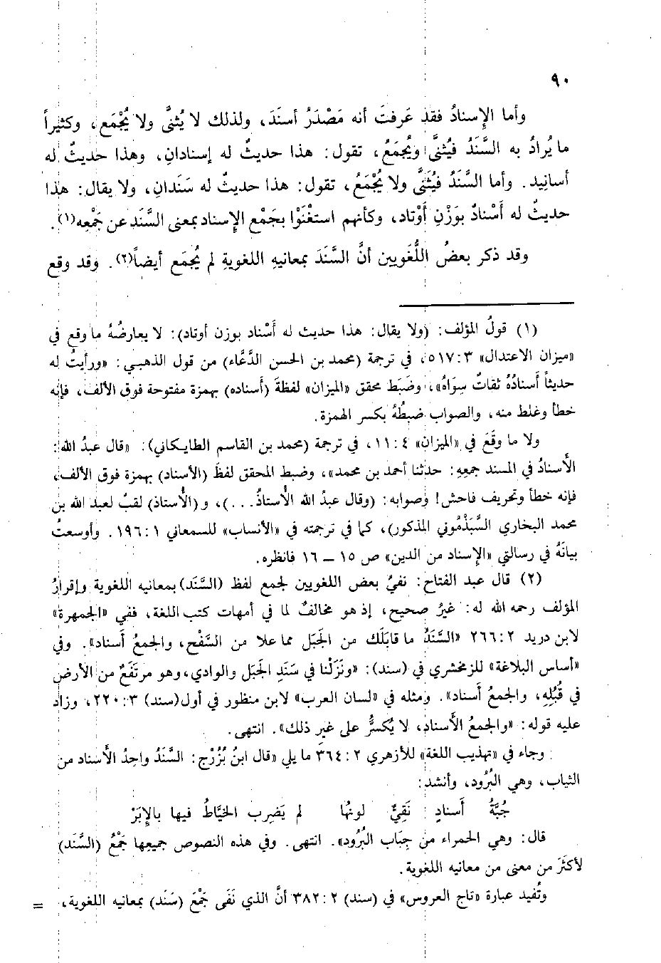 وَأما الْإِسْنَاد فقد عرفت أَنه مصدر أسْند وَلذَلِك لَا يثنى وَلَا يجمع وكثرا مَا يُرَاد بِهِ السَّنَد فيثنى وَيجمع تَقول هَذَا حَدِيث لَهُ إسنادان وَهَذَا حَدِيث لَهُ أَسَانِيد وَأما السَّنَد فيثنى وَلَا يجمع تَقول هَذَا حَدِيث لَهُ سندان وَلَا يُقَال هَذَا حَدِيث لَهُ أسناد بِوَزْن أوتاد وَكَأَنَّهُم استغنوا بِجمع الْإِسْنَاد بِمَعْنى السَّنَد عَن جمعه وَقد ذكر بعض اللغويين أَن السَّنَد بمعانيه اللُّغَوِيَّة لم يجمع أَيْضا وَقد وَقع