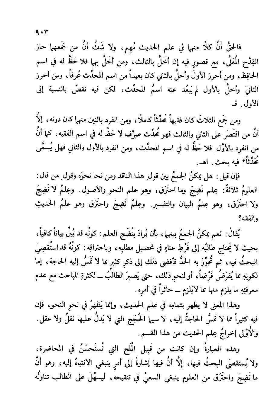 وَهَذَا الْمَعْنى لَا يظْهر بتمامة فِي علم الحَدِيث وَإِنَّمَا يظْهر فِي نَحْو النَّحْو فَإِن فِيهِ كثيرا مِمَّا لَا تمس الْحَاجة إِلَيْهِ لَا سِيمَا الْحجَج الَّتِي لَا يدل عَلَيْهَا نقل وَلَا عقل وَالْأولَى إِخْرَاج علم الحَدِيث من هَذَا الْقسم