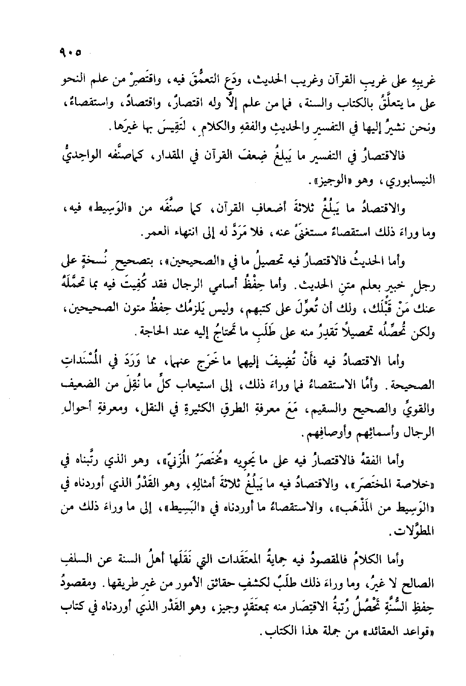 وَأما الْفِقْه فالاقتصار فِيهِ على مَا يحويه مُخْتَصر الْمُزنِيّ وَهُوَ الَّذِي رتبناه فِي خُلَاصَة الْمُخْتَصر والاقتصاد يه مَا يبلغ ثَلَاثَة أَمْثَاله وَهُوَ الْقدر الَّذِي أوردناه فِي الْوَسِيط من الْمَذْهَب والاسقصاء مَا أوردناه فِي الْبَسِيط إِلَى مَا وَرَاء ذَلِك من المطولات