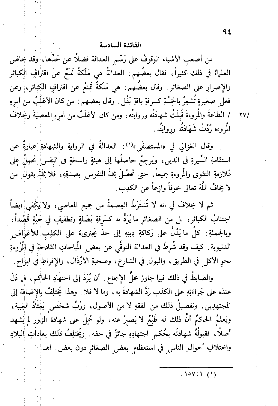 وَقَالَ الْغَزالِيّ فِي الْمُسْتَصْفى الْعَدَالَة فِي الرِّوَايَة وَالشَّهَادَة عبارَة عَن استقامة السِّيرَة فِي الدّين وَيرجع حاصلها إِلَى هَيْئَة راسخة فِي النَّفس تحمل على مُلَازمَة التَّقْوَى والمروءة جَمِيعًا حَتَّى تحصل ثِقَة النُّفُوس بصدقه فَلَا ثِقَة بقول من لَا يخَاف الله تَعَالَى خوفًا وازعا عَن الْكَذِب