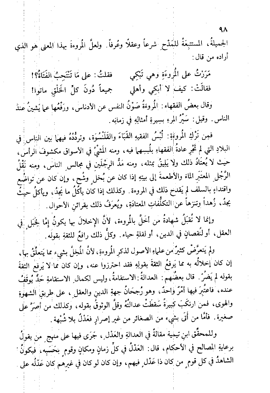 وَلم يتَعَرَّض كثير من عُلَمَاء الْأُصُول لذكر الْمُرُوءَة لِأَن المخل بِشَيْء مِمَّا يتَعَلَّق بهَا إِن كَانَ إخلاله بِهِ مِمَّا يرفع الثِّقَة بقوله فقد احترزوا عَنهُ وَإِن كَانَ مِمَّا لَا يرفع الثِّقَة بقوله لم يضر قَالَ بَعضهم الْعَدَالَة الاسْتقَامَة وَلَيْسَ لكَمَال الاسْتقَامَة حد يُوقف عِنْده فَاعْتبر فِيهَا أَمر وَاحِد وَهُوَ رُجْحَان جِهَة الدّين وَالْعقل على طَرِيق الشَّهْوَة والهوى فَمن ارْتكب كَبِيرَة سَقَطت عَدَالَته وَقل الوثوق بقوله وَكَذَلِكَ من أصر على صَغِيرَة فَأَما من أَتَى بِشَيْء من الصَّغَائِر من غير إِصْرَار فَعدل بِلَا شُبْهَة