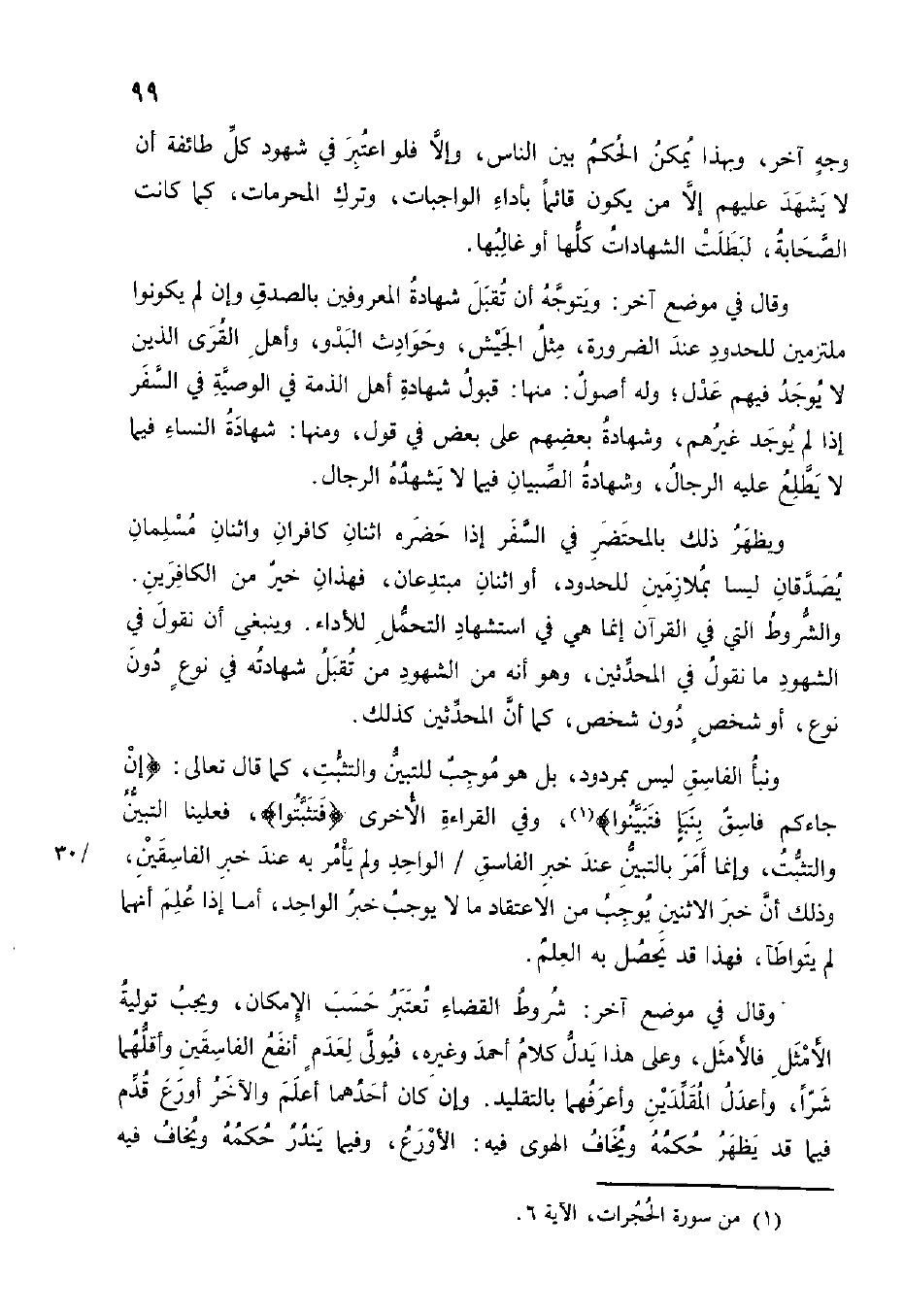 وَقَالَ فِي مَوضِع آخر وَيتَوَجَّهُ أَن تقبل شَهَادَة المعروفين بِالصّدقِ وَإِن لم يَكُونُوا ملتزمين للحدود عِنْد الضَّرُورَة مثل الْجَيْش وحوادث البدو وَأهل الْقرى الَّذين لَا يُوجد فيهم عدل وَله أصُول مِنْهَا قبُول شَهَادَة أهل الذِّمَّة فِي الْوَصِيَّة فِي السّفر إِذا لم يُوجد غَيرهم وَشَهَادَة بَعضهم على بعض فِي قَول وَمِنْهَا شَهَادَة النِّسَاء فِيمَا لَا يطلع عَلَيْهِ الرِّجَال وَشَهَادَة الصّبيان فِيمَا لَا يشهده الرِّجَال