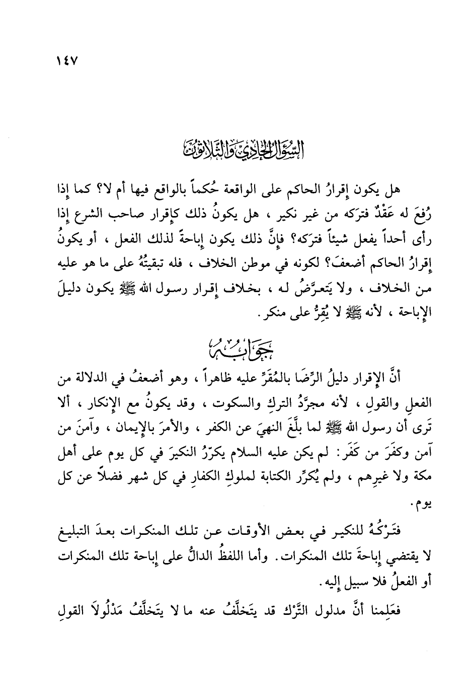 أنَّ الِإقرار دليلُ الرِّضَا بالمُقَرِّ عليه ظاهراً، وهو أضعفُ في الدلالة من الفعلِ والقولِ، لأنه مجرَّدُ التركِ والسكوت، وقد يكونُ مع الإِنكار، ألا تَرى أن رسول الله - صلى الله عليه وسلم - لما بلَّغَ النهيَ عن الكفر، والأمرَ بالِإيمان، وآمنَ من آمن وكفَرَ من كَفَر: لم يكن - عليه السلام - يكرّرُ النكيرَ في كل يوم على أهل مكة ولا غيرِهم، ولم يُكرر الكتابة لملوكِ الكفارِ في كل شهر فضلاً عن كل يوم.