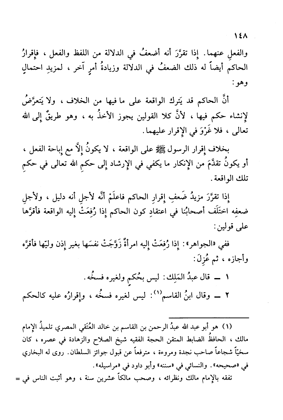 أنَّ الحاكم قد يَترك الواقعة على ما فيها من الخلاف، ولا يَتعرَّضُ لِإنشاء حكم فيها، لأنَّ كلا القولين يجوز الأخذُ به، وهو طريقٌ إِلى الله تعالى، فلا غَرْوَ في الإِقرار عليهما.
