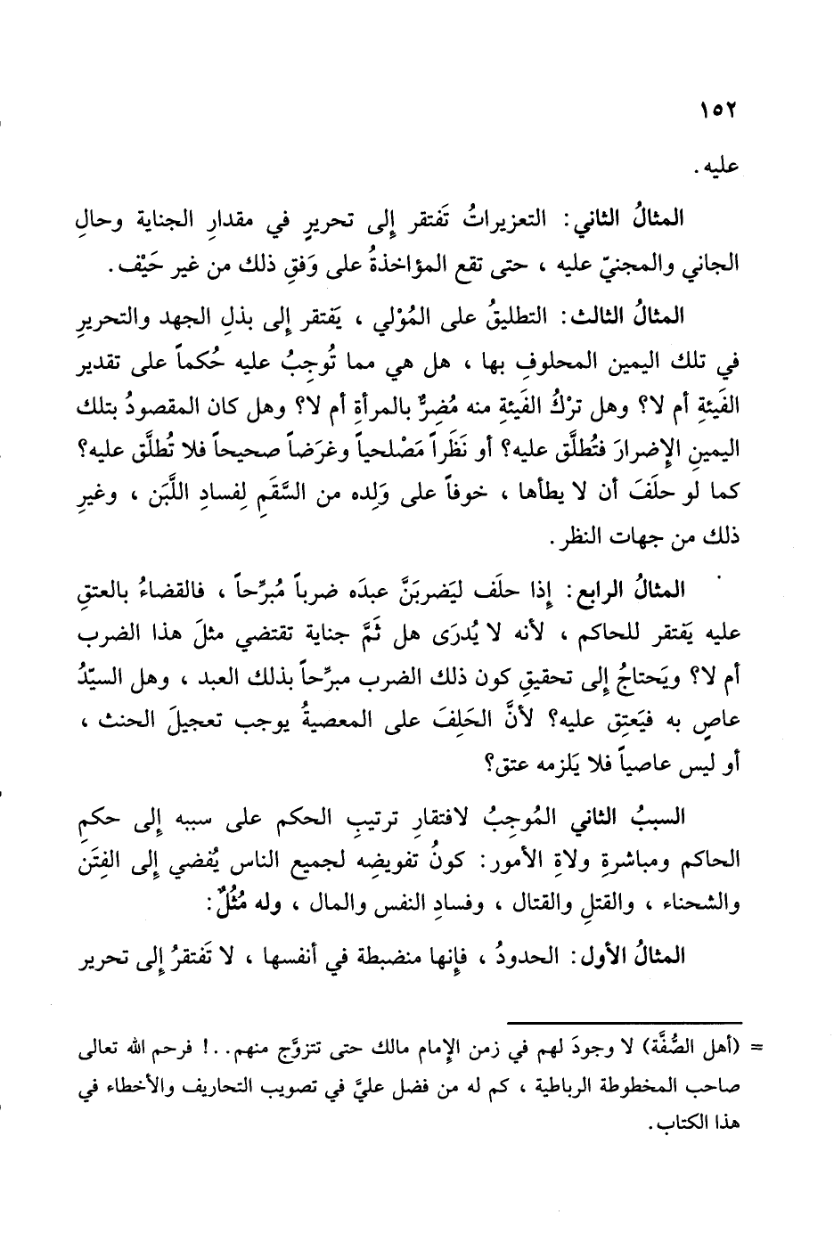 المثالُ الرابع: إِذا حلَف ليَضربَنَ عبدَه ضرباً مُبرِّحًا، فالقضاءُ بالعتقِ عليه يفتقر للحاكم؛ لأنه لا يُدرَى هل ثمَّ جناية تقتضي مثلَ هذا الضرب أم لا؟ ويَحتاجُ إِلى تحقيقِ كون ذلك الضرب مبرِّحًا بذلك العبد، وهل السيّدُ عاصٍ به فيَعتِق عليه؟ لأنَّ الحَلِفَ على المعصيةُ يوجب تعجيلَ الحنث، أو ليس عاصياً فلا يَلزمه عتق؟