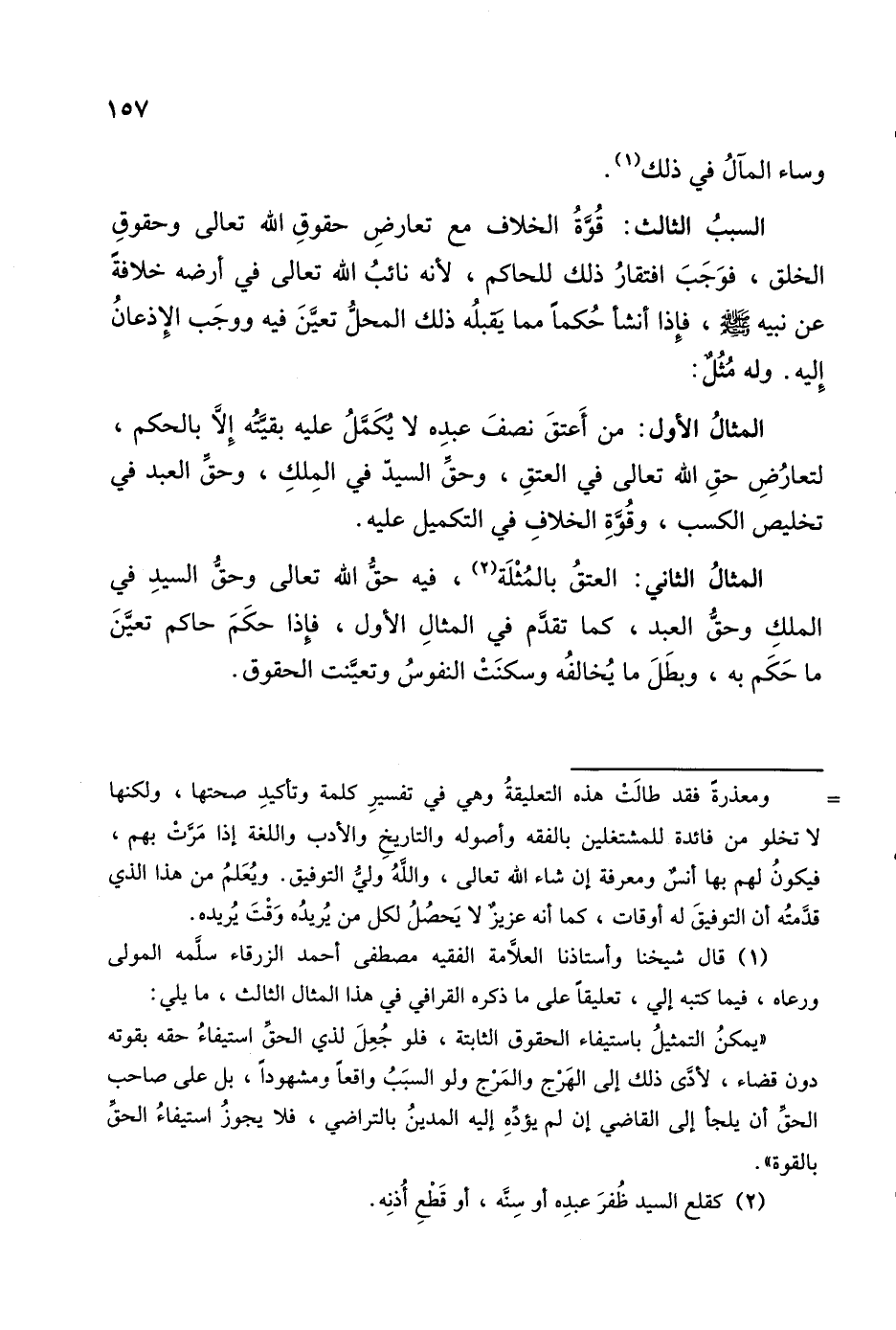 (١) قال شيخنا وأستاذنا العلَّامة الفقيه مصطفى أحمد الزرقاء سلَّمه المولى ورعاه، فيما كتبه إلى، تعليقًا على ما ذكره القرافي في هذا المثال الثالث، ما يلي:
