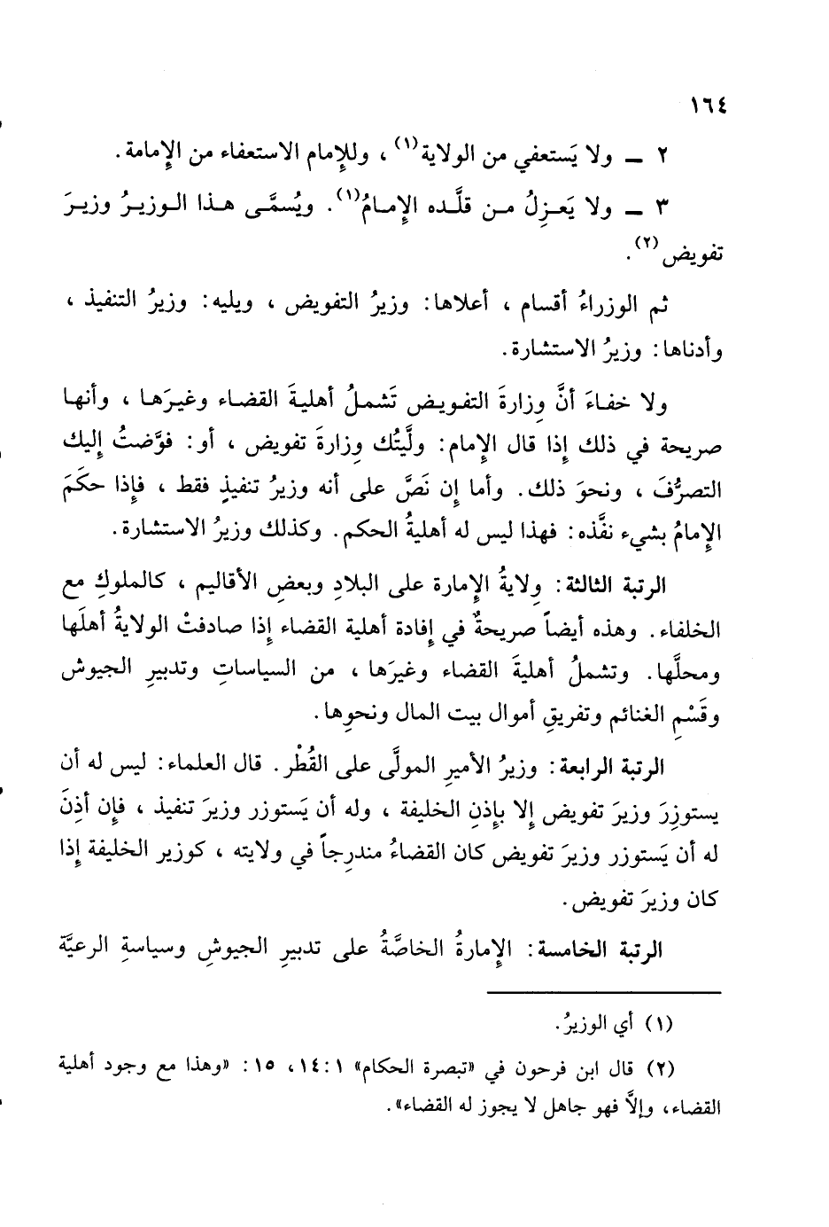 ولا خفاءَ أنَّ وِزارةَ التفويض تَشملُ أهليةَ القضاء وغيرَها، وأنها صريحة في ذلك إِذا قال الإِمام: ولَّيتُك وِزارةَ تفويض، أو: فوَّضتُ إِليك التصرُفَ، ونحوَ ذلك. وأما إِن نَصَّ على أنه وزيرُ تنفيذٍ فقط، فإِذا حكَمَ الإِمامُ بشيء نفَّذه: فهذا ليس له أهليةُ الحكم. وكذلك وزيرُ الإستشارة.