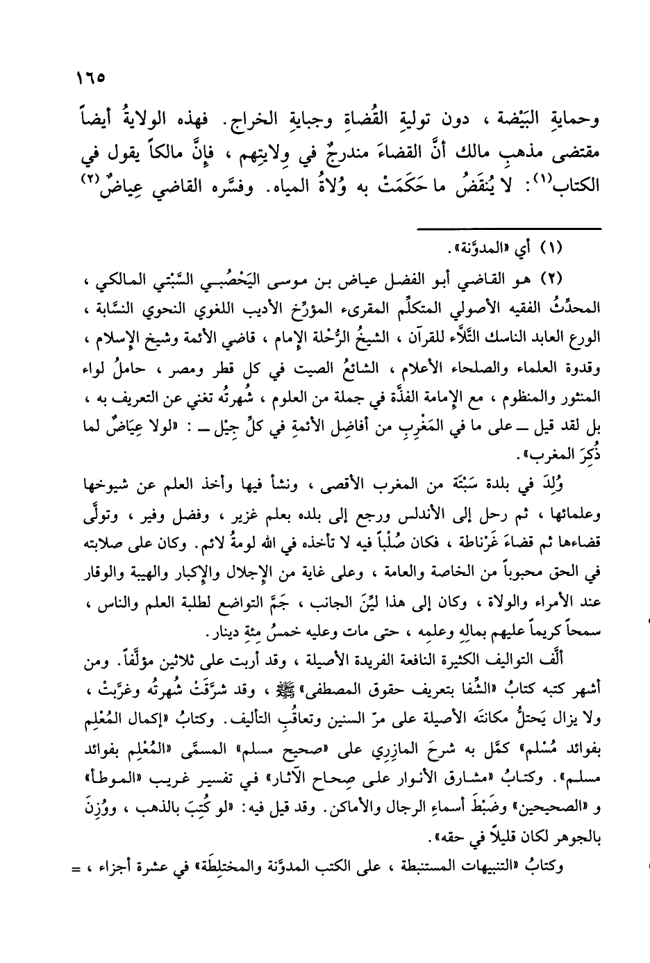(٢) هو القاضي أبو الفضل عياض بن موسى اليَحْصُبي السَّبْتي المالكي، المحدِّثُ الفقيه الأصولي المتكلِّم المقرئ المؤرّخ الأديب اللغوي النحوي النسَّابة، الورع العابد الناسك التَّلَّاء للقرآن، الشَّيخُ الرُحْلة الإِمام، قاضي الأئمة وشيخ الإِسلام، وقدوة العلماء والصلحاء الأعلام، الشائعُ الصيت في كلِّ قطر ومصر، حاملُ لواء المنثور والمنظوم، مع الإِمامة الفذة في جملة من العلوم، شُهرتُه تغني عن التعريف به، بل لقد قيل - على ما في المَغْرِبِ من أفاضِل الأئمةِ في كلِّ جِيْل -: "لولا عِيَاضْ لما ذُكِرَ المغرب".