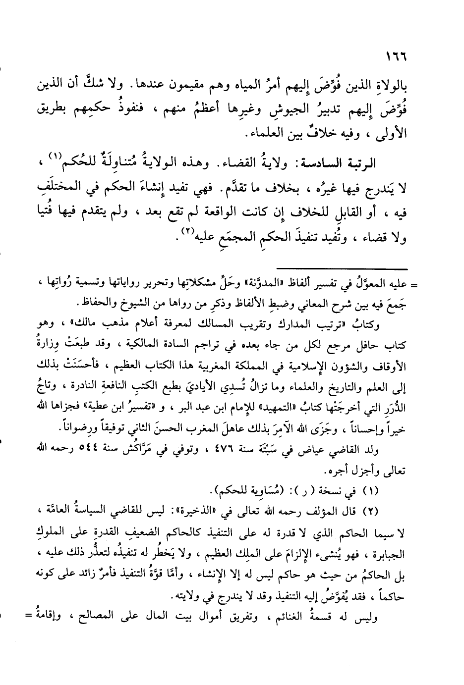 وكتابُ "ترتيب المدارك وتقريب المسالك لمعرفة أعلام مذهب مالك"، وهو كتاب حافل مرجع لكل من جاء بعده في تراجم السادة المالكية، وقد طبعَتْ وِزارةُ الأوقاف والشؤون الإِسلامية في المملكة المغربية هذا الكتاب العظيم، فأحسَنَتْ بذلك إلى العلم والتاريخ والعلماء وما تزالُ تُسدِي الأياديَ بطبع الكتبِ النافعةِ النادرة، وتاجُ الدرَرِ التي أخرجَتْها كتابُ "التمهيد" للإِمام ابن عبد البر، و"تفسيرُ ابن عطية" فجزاها الله خيرًا وإحسانًا، وجَزَى الله الآمِرَ بذلك عاهلَ المغرب الحسنَ الثاني توفيقاً ورِضواناً.