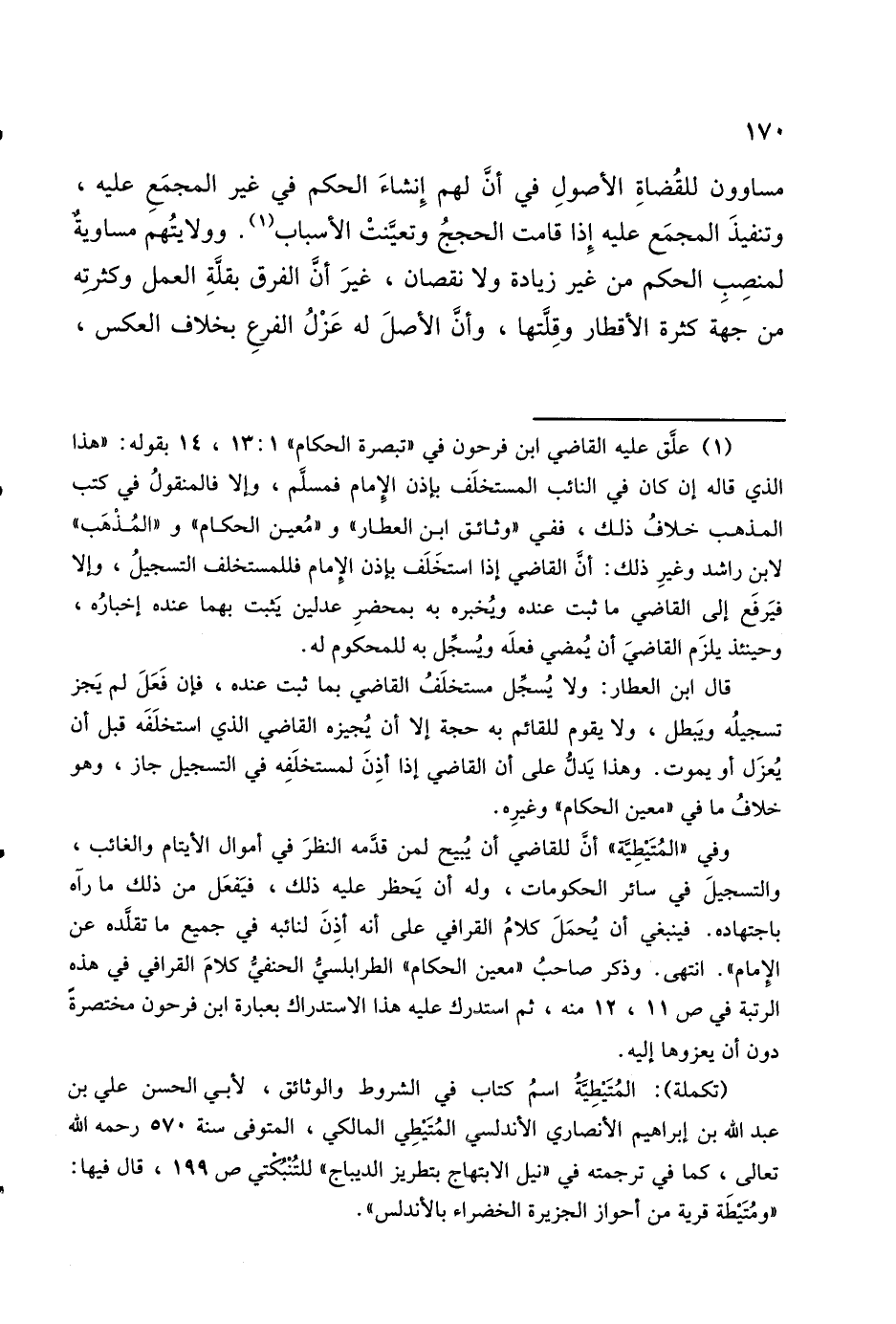 (١) علَّق عليه القاضي ابن فرحون في "تبصرة الحكام" ١: ١٣، ١٤ بقوله: "هذا الذي قاله إن كان في النائب المستخلَف بإذن الإِمام فمسلَّم، وإلا فالمنقولُ في كتب المذهب خلافُ ذلك، ففي "وثائق ابن العطار" و"مُعين الحكام" و"المُذْهَب" لإبن راشد وغيرِ ذلك: أن القاضي إذا استخَلَف بإذن الإِمام فللمستخلف التسجيلُ، وإلا فيَرفَع إلى القاضي ما ثبت عنده ويُخبره به بمحضرِ عدلين يَثبت بهما عنده إخبارُه، وحينئذ يلزَم القاضيَ أن يُمضي فعلَه ويُسجل به للمحكوم له.