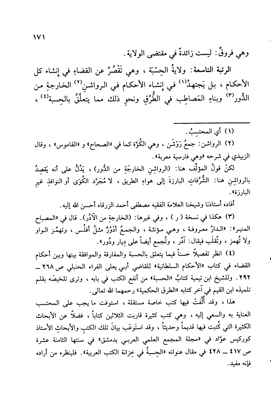 (٤) انظر تفصيلًا حسنًا فيما يتعلق بالحسبة والمفارقة والموافقة بينها وبين أحكام القضاء في كتاب "الأحكام السلطانية" للقاضي أبي يعلى الفراء الحنبلي ص ٢٦٨ - ٢٩٢. وللشيخ ابن تيمية كتابُ "الحسبة" من أنفع الكتب في بابه، وترى تلخيصَه بقلم تلميذه ابن القيم في آخر كتابه "الطرق الحكمية" - رَحِمَهُمَا اللهُ تَعَالَى -.