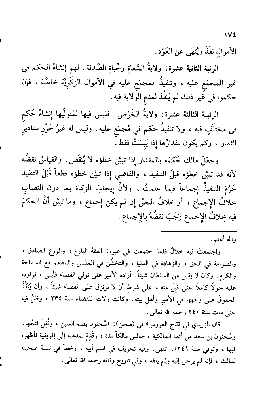 قال الزبيدي في "تاج العروس" في (سحن): "سُحنون بضم السين، ونُقِلَ فتحُها. وسُحنون بن سعد من أئمة المالكية، جالس مالكاً مدة، وقَدِمَ بمذهبه إلى إفريقية فأظهره فيها، وتوفي سنة ٢٤١". انتهى. وفيه تحريف في اسم أبيه، وخطأ في نسبة صحبته لمالك، فإنه لم يرحل إليه ولم يلقه، وفي تاريخ وفاته - رَحِمَهُ اللهُ تَعَالَى -.