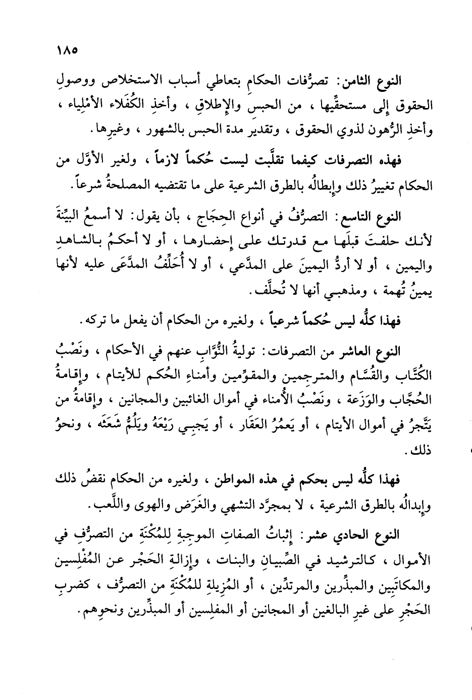 النوع الثامن: تصرُّفات الحكامِ بتعاطي أسباب الإستخلاص ووصولِ الحقوق إِلى مستحقِّيها، من الحبسِ والإِطلاقِ، وأخذِ الكُفَلاء الأمْلِياء، وأخذِ الرُّهون لذوي الحقوق، وتقدير مدة الحبس بالشهور، وغيرِها.