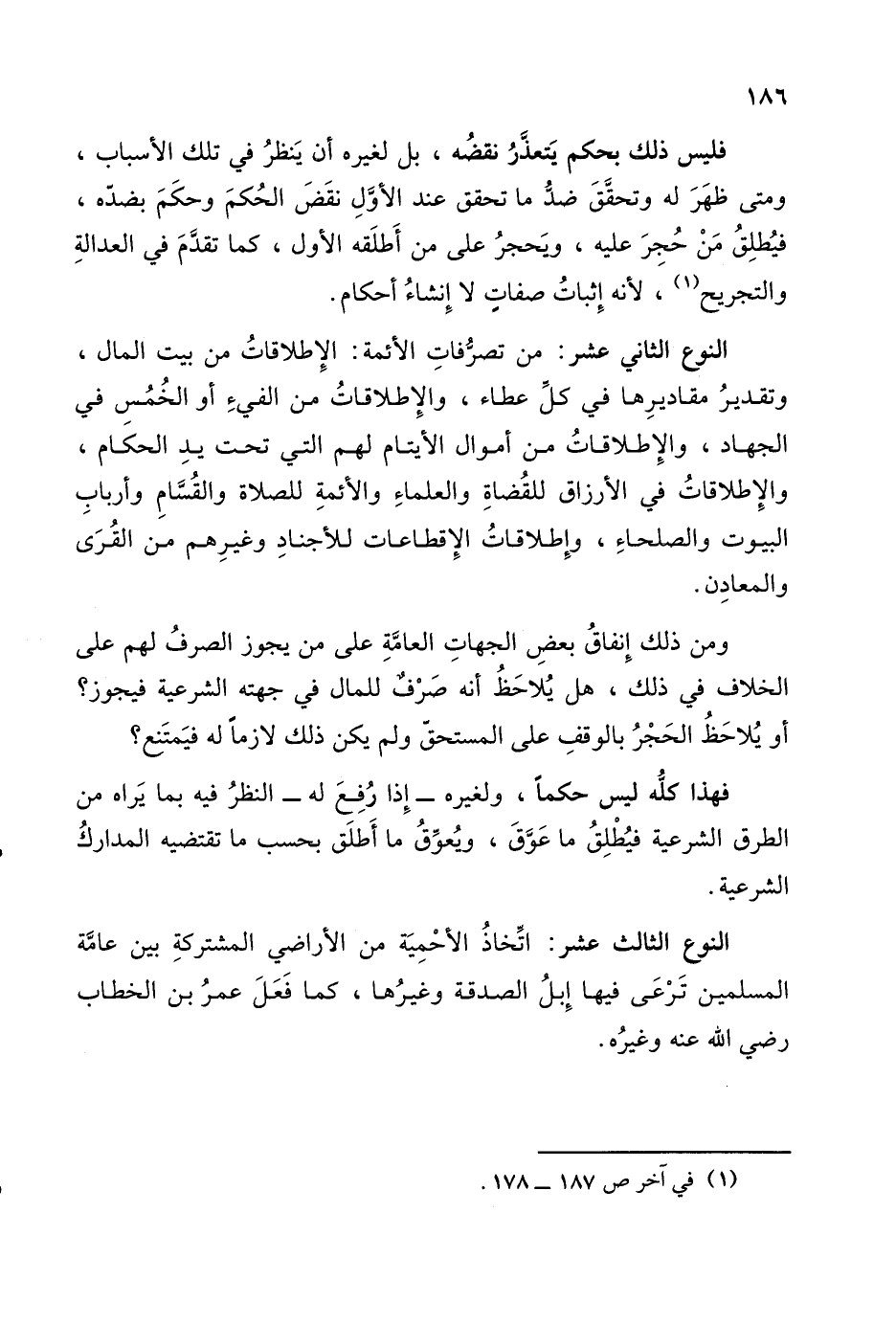 النوع الثاني عشر: من تصرُّفاتِ الأئمة: الإِطلاقاتُ من بيت المال، وتقديرُ مقاديرِها في كلِّ عطاء، والإِطلاقاتُ من الفيءِ أو الخُمُسِ في الجهاد، والإِطلاقاتُ من أموال الأيتام لهم التي تحت يدِ الحكام، والإِطلاقاتُ في الأرزاق للقُضاةِ والعلماءِ والأئمةِ للصلاة والقُسَّامِ وأربابِ البيوت والصلحاءِ، وإِطلاقاتُ الإِقطاعات للأجنادِ وغيرِهم من القُرَى والمعادِن.