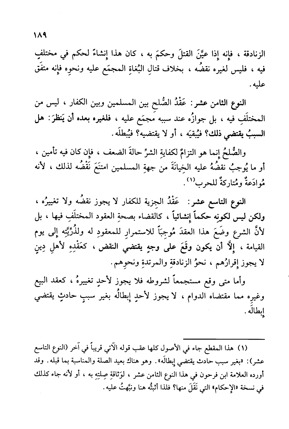 (١) هذا المقطع جاء في الأصول كلها عقب قوله الآتي قريبًا في آخر (النوع التاسع عشر): "بغير سبب حادث يقتضي إِبطالَه". وهو هناك بعيد الصلة والمناسبة بما قبله. وقد أورده العلامة ابن فرحون في هذا النوع الثامن عشر، لوَثاقةِ صِلتِهِ به، أو لأنه جاء كذلك في نسخة "الإحكام" التي نَقَلَ منها؟ فلذا أثبته هنا ونبهتُ عليه.