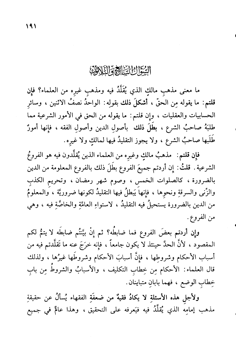 فإِن قلتم: مذهبُ مالكٍ وغيرِه من العلماء الذين يقلَّدون فيه هو الفروعُ الشرعية. قلتُ: إِن أردتم جميعَ الفروع بطَلَ ذلك بالفروع المعلومة من الدين بالضرورة، كالصلوات الخمسِ، وصوم شهر رمضان، وتحريمِ الكذبِ والزِّنى والسرقةِ ونحوِها، فإِنها يَبطلُ فيها التقليدُ لكونها ضروريَّة، والمعلومُ من الدين بالضرورة يستحيلُ فيه التقليدُ، لاستواءِ العامَّةِ والخاصَّةِ فيه، وهي من الفروع.