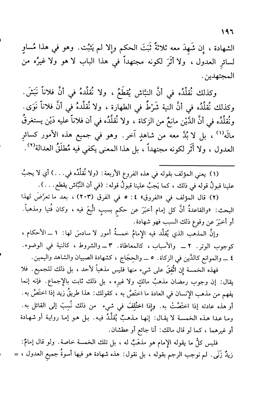 وكذلك نُقلدُه في أنَّ النبَّاش يقطعُ، ولا نُقلدهُ في أنَّ فلانًا نَبَشَ. وكذلك نُقلدُه في أنَّ النية شَرْطٌ في الطهارة، ولا نُقلدهُ في أن فلانًا نَوَى. ونُقلدُه في أن الدَّيْن مانعٌ من الزكاة، ولا نُقلدُه في أن فلانًا عليه دَيْن يستغرقُ مالَه (١)، بل لابُدَّ معه من شاهدٍ آخر. وهو في جميع هذه الأمور كسائرِ العدول، ولا أثر لكونه مجتهداً، بل هذا المعنى يكفي فيه مُطلَقُ العدالة (٢).