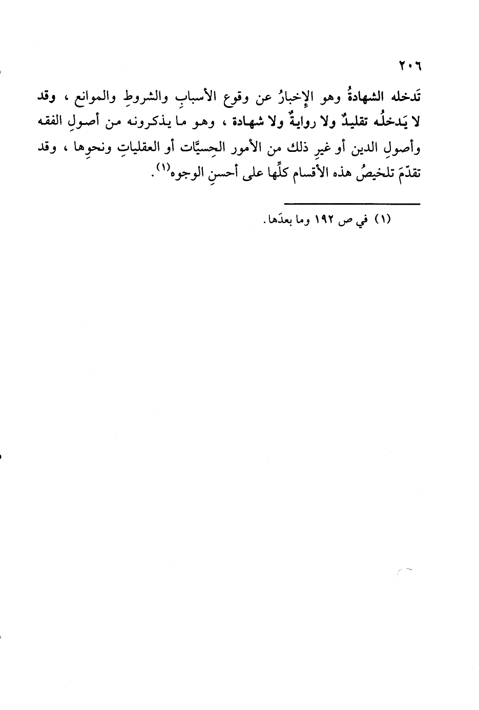 تَدخله الشهادةُ وهو الإِخبارُ عن وقوع الأسبابِ والشروطِ والموانع، وقد لا يَدخلُه تقليدٌ ولا روايةٌ ولا شهادة، وهو ما يذكرونه من أصولِ الفقه وأصولِ الدين أو غيرِ ذلك من الأمور الحِسيَّات أو العقلياتِ ونحوِها، وقد تقدّمَ تلخيصُ هذه الأقسام كلِّها على أحسنِ الوجوه (١).