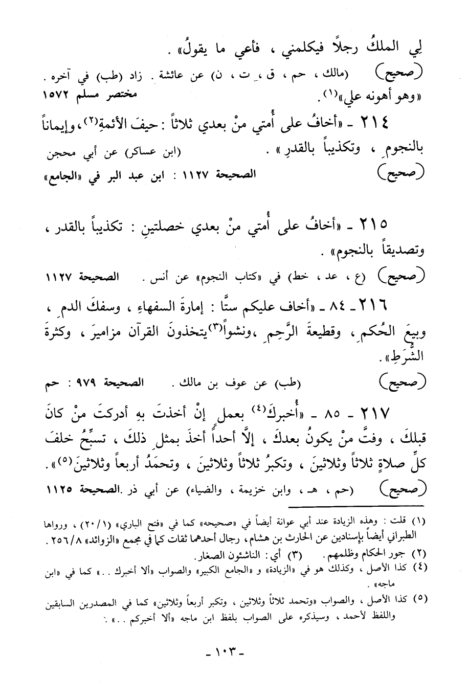 214 - «أخاف على أمتي من بعدي ثلاثا: حيف الأئمة2 وإيمانا بالنجوم وتكذيبا بالقدر» .