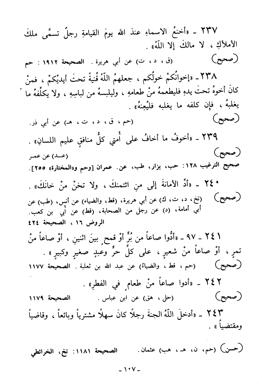 241 - 97 - «أدوا صاعا من بر أو قمح بين اثنين أو صاعا من تمر أو صاعا من شعير على كل حر وعبد صغير وكبير» .
