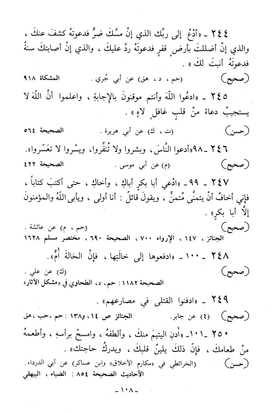 244 - «ادع إلى ربك الذي إن مسك ضر فدعوته كشف عنك, والذي إن أضللت بأرض قفر فدعوته رد عليك, والذي إن أصابتك سنة فدعوته أنبت لك» .