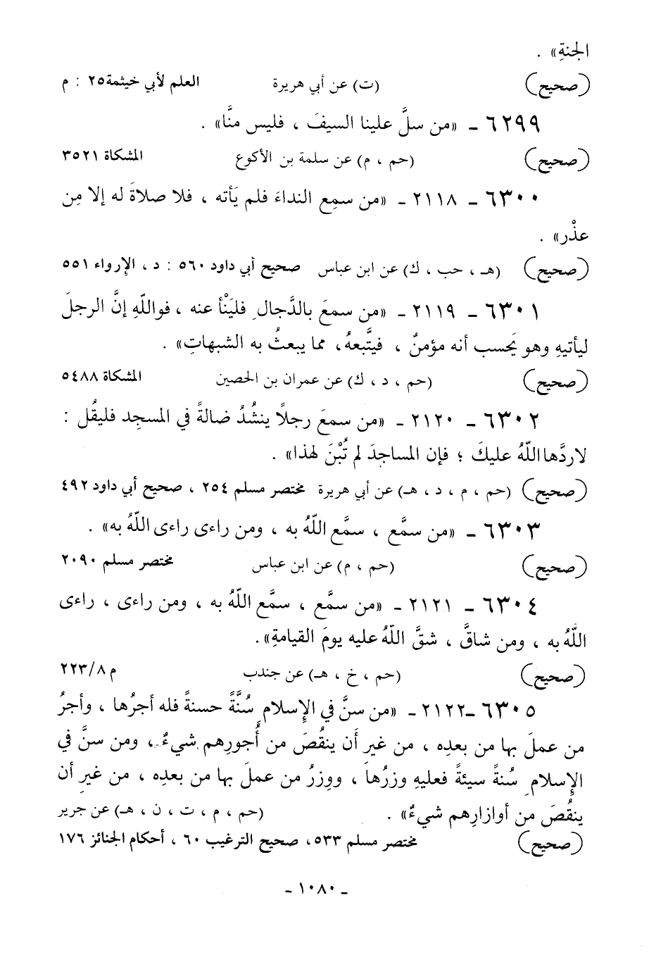 6305 - 2122 - «من سن في الإسلام سنة حسنة فله أجرها وأجر من عمل بها من بعده من غير أن ينقص من أجورهم شيء ومن سن في الإسلام سنة سيئة فعليه وزرها ووزر من عمل بها من بعده من غير أن ينقص من أوزارهم شيء» ... [حم م ت ن هـ] عن جرير.