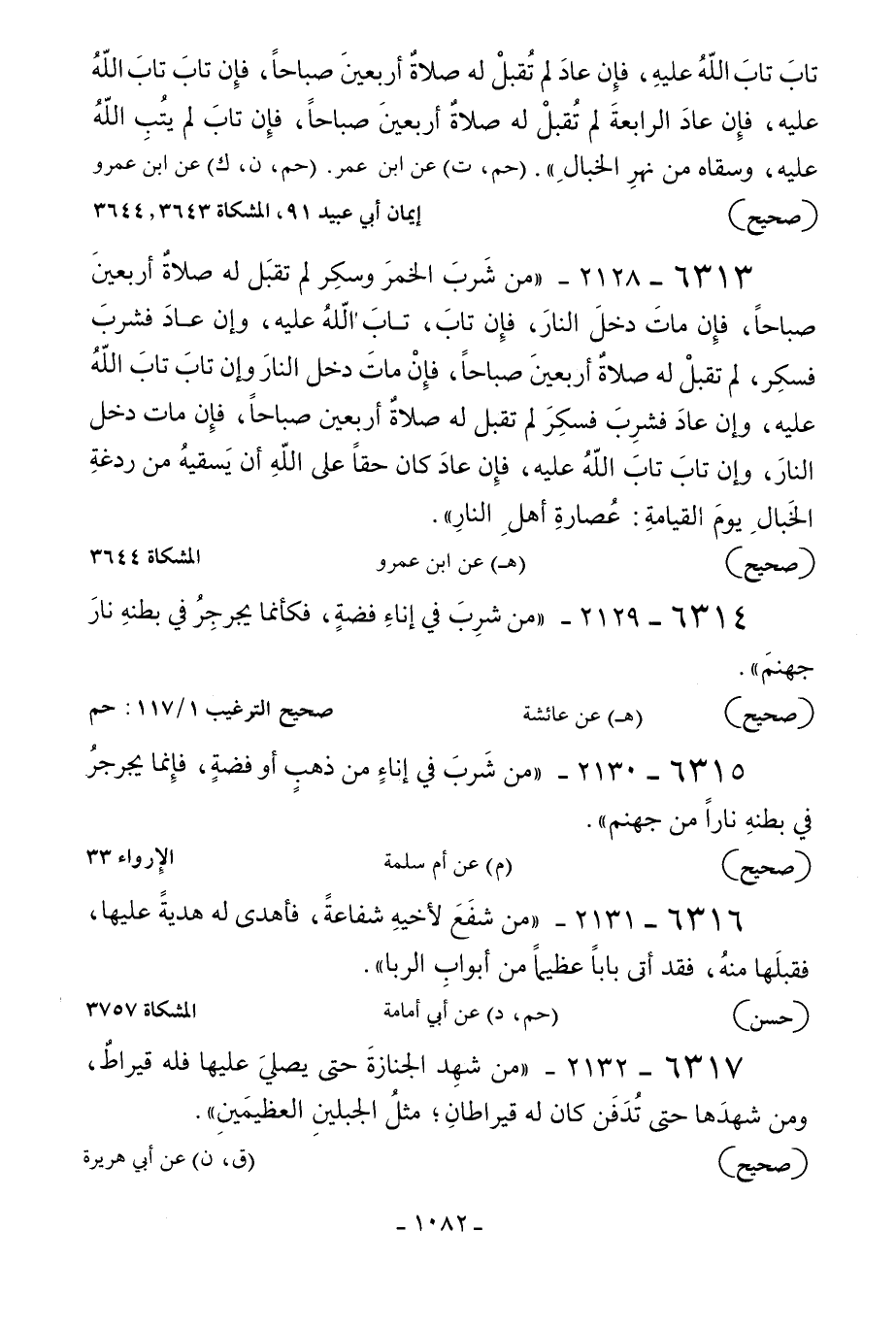 6313 - 2128 - «من شرب الخمر وسكر لم تقبل له صلاة أربعين صباحا فإن مات دخل النار فإن تاب تاب الله عليه وإن عاد فشرب فسكر لم تقبل له صلاة أربعين صباحا فإن مات دخل النار وإن تاب تاب الله عليه وإن عاد فشرب فسكر لم تقبل له صلاة أربعين صباحا فإن مات دخل النار وإن تاب تاب الله عليه فإن عاد كان حقا على الله أن يسقيه من ردغة الخبال يوم القيامة: عصارة أهل النار» .