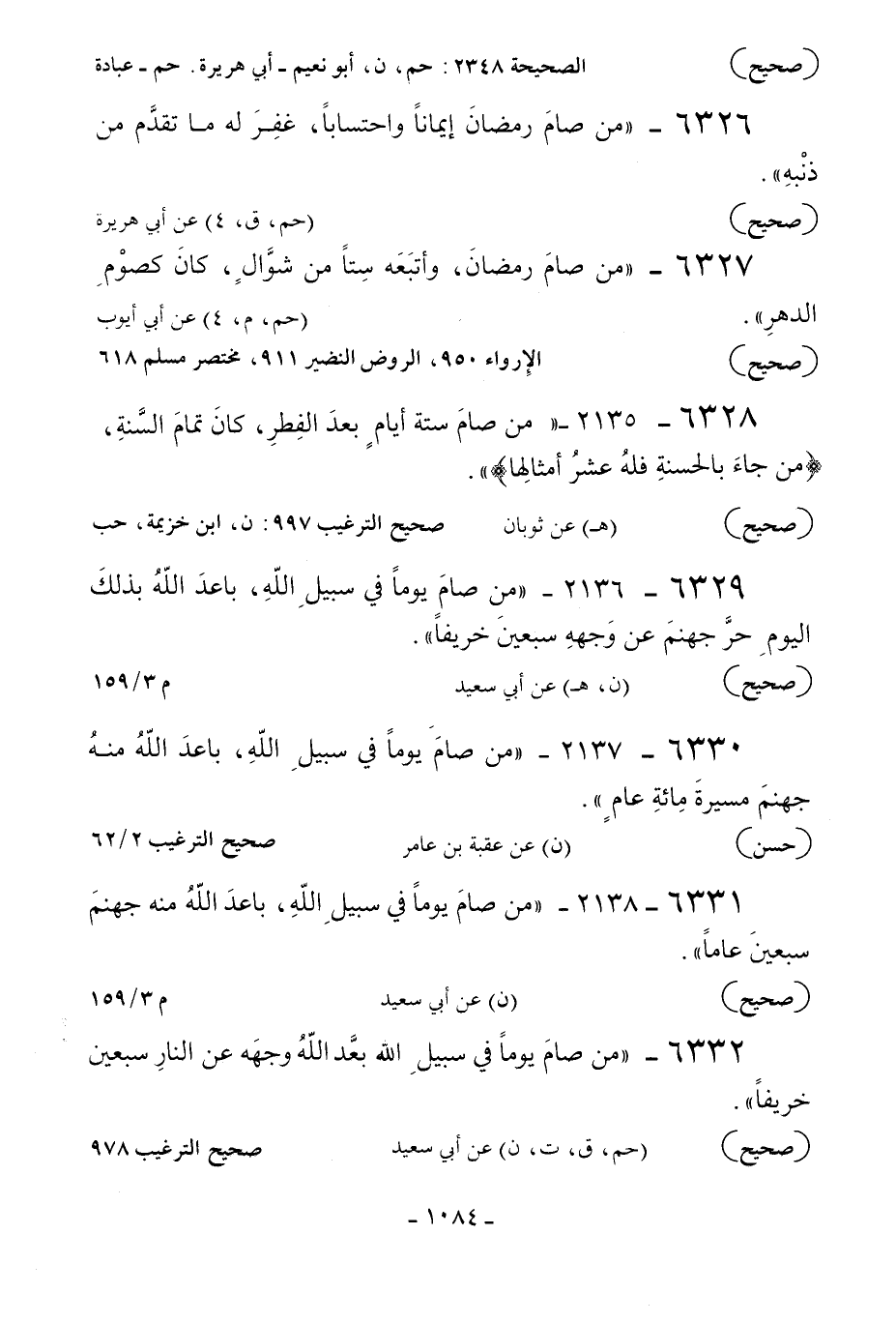 6331 - 2138 - «من صام يوما في سبيل الله باعد الله وجهه من جهنم سبعين عاما» .