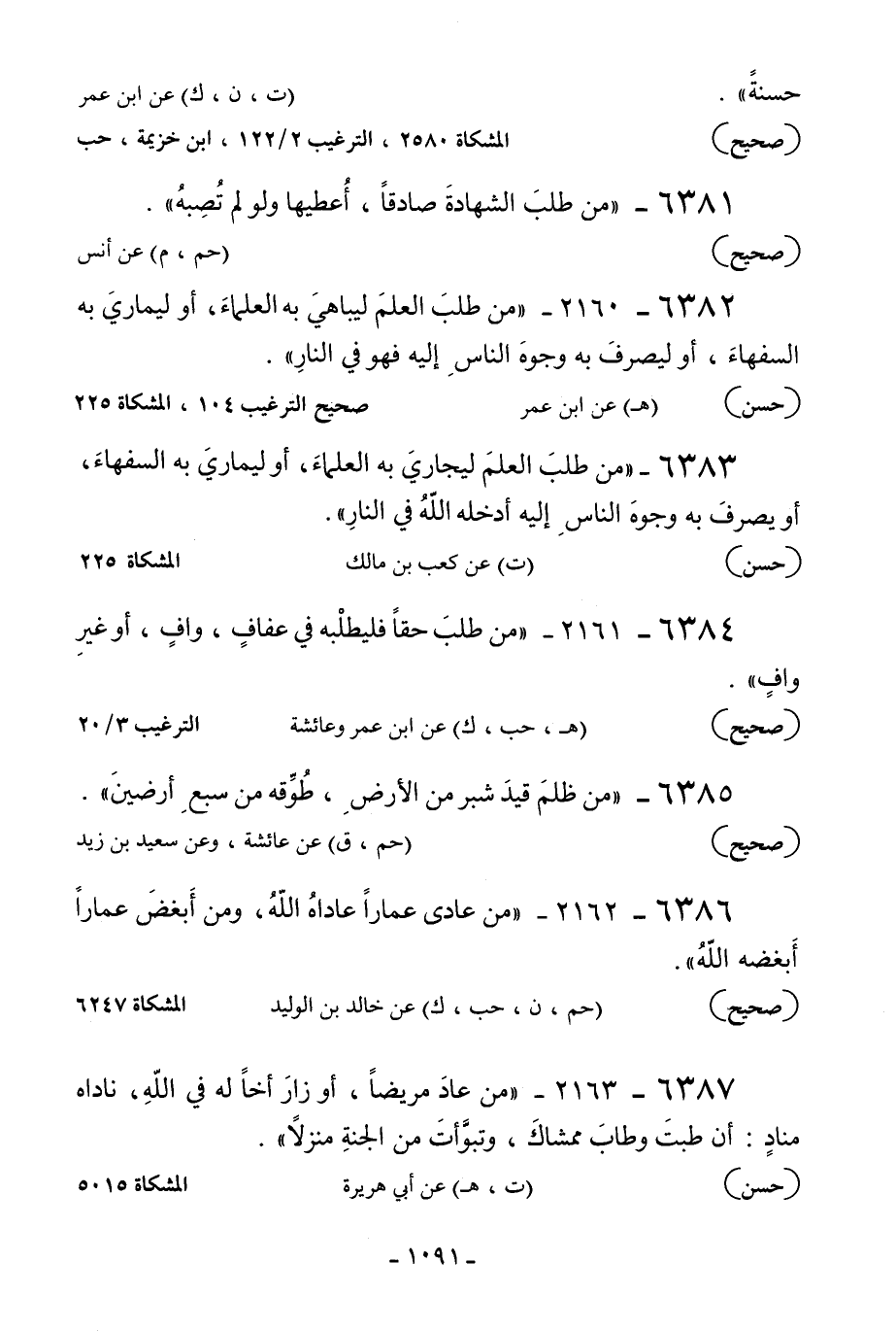 6382 - 2160 - «من طلب العلم ليباهي به العلماء أو ليماري به السفهاء أو ليصرف به وجوه الناس إليه فهو في النار» .
