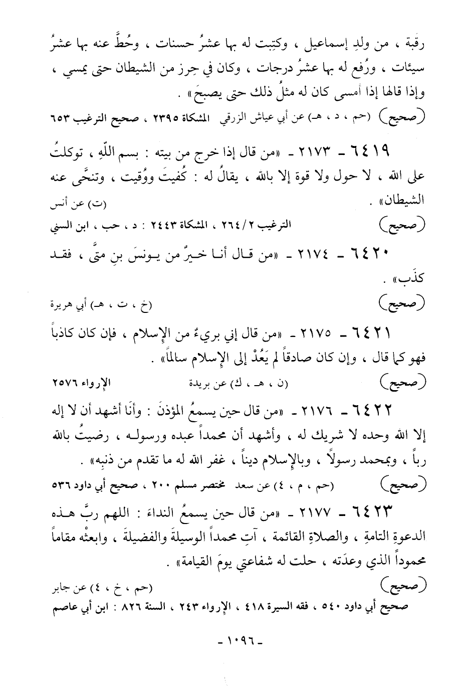 6419 - 2173 - «من قال إذا خرج من بيته: بسم الله توكلت على الله لا حول ولا قوة إلا بالله يقال له: كفيت ووقيت وتنحى عنه الشيطان» ... [ت] عن أنس.